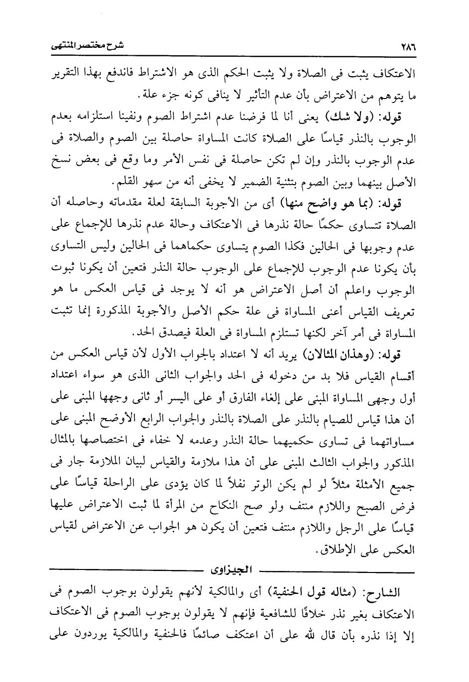 قوله: (وهذان المثالان) يريد أنه لا اعتداد بالجواب الأول لأن قياس العكس من أقسام القياس فلا بد من دخوله فى الحد والجواب الثانى الذى هو سواء اعتداد أول وجهى المساواة المبنى على إلغاء الفارق أو على اليسر أو ثانى وجهها المبنى على أن هذا قياس للصيام بالنذر على الصلاة بالنذر والجواب الرابع الأوضح المبنى على مساواتهما فى تساوى حكميهما حالة النذر وعدمه لا خفاء فى اختصاصها بالمثال المذكور والجواب الثالث المبنى على أن هذا ملازمة والقياس لبيان الملازمة جار فى جميع الأمثلة مثلًا لو لم يكن الوتر نفلًا لما كان يؤدى على الراحلة قياسًا على فرض الصبح واللازم منتف ولو صح النكاح من المرأة لما ثبت الاعتراض عليها قياسًا على الرجل واللازم منتف فتعين أن يكون هو الجواب عن الاعتراض لقياس العكس على الإطلاق.