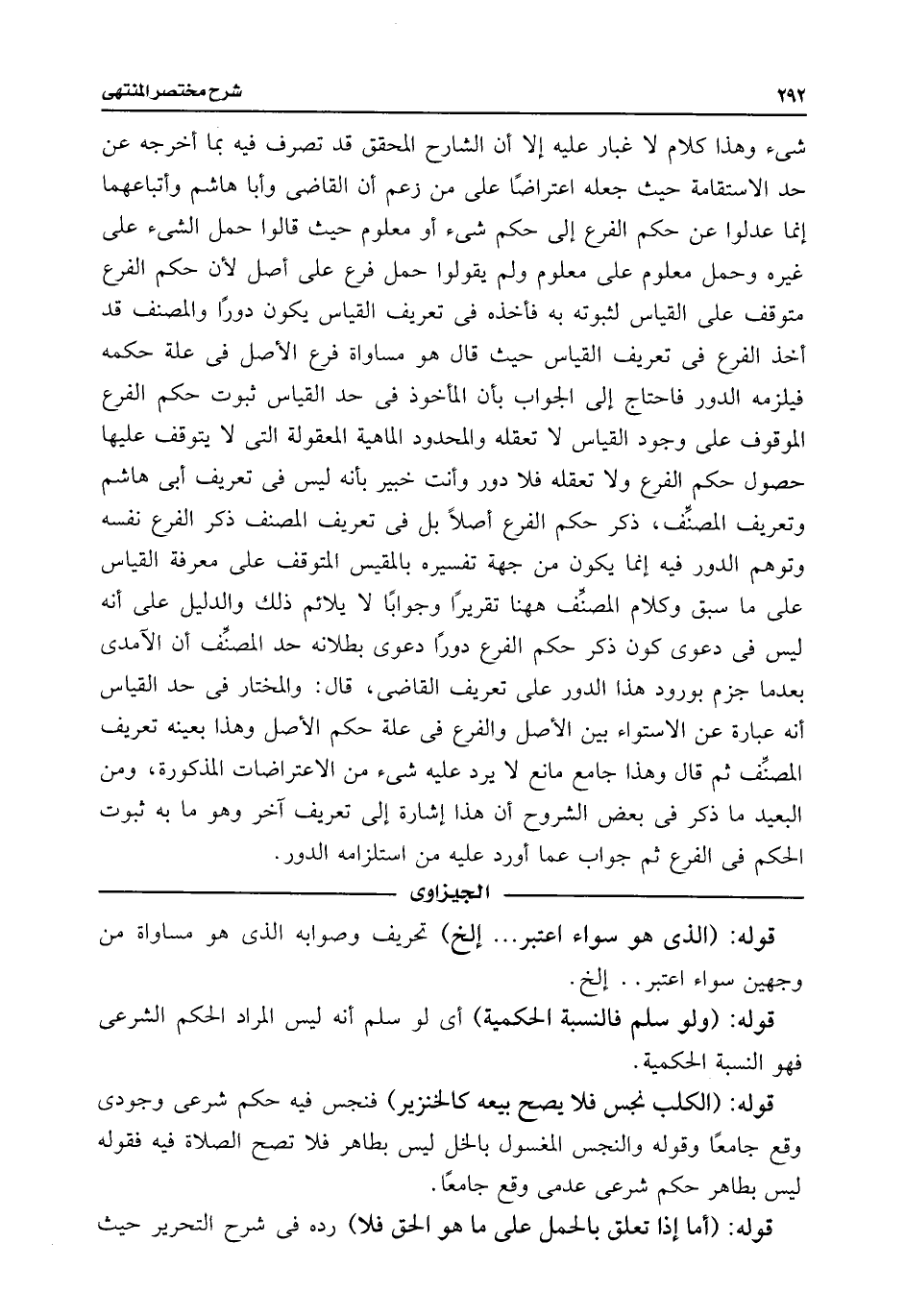 قوله: (الكلب نجس فلا يصح بيعه كالخنزير) فنجس فيه حكم شرعى وجودى وقع جامعًا وقوله والنجس المغسول بالخل ليس بطاهر فلا تصح الصلاة فيه فقوله ليس بطاهر حكم شرعى عدمى وقع جامعًا.