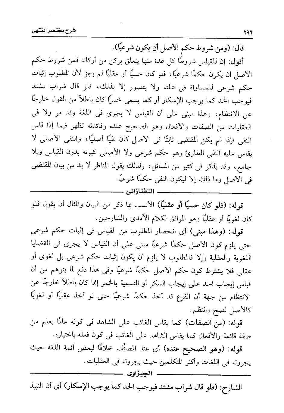 أقول: إن للقياس شروطًا كل عدة منها يتعلق بركن من أركانه فمن شروط حكم الأصل أن يكون حكمًا شرعيًا، فلو كان حسيًا أو عقليًا لم يجز لأن المطلوب إثبات حكم شرعى للمساواة فى علته ولا يتصور إلا بذلك، فلو قال شراب مشتد فيوجب الحد كما يوجب الإسكار أو كما يسمى خمرًا كان باطلًا من القول خارجًا عن الانتظام، وهذا مبنى على أن القياس لا يجرى فى اللغة وقد مر ولا فى العقليات من الصفات والأفعال وهو الصحيح عنده وفائدته تظهر فيما إذا قاس النفى فإذا لم يكن المقتضى ثابتًا فى الأصل كان نفيًا أصليًا، والنفى الأصلى لا يقاس عليه النفى الطارئ وهو حكم شرعى ولا الأصلى لثبوته بدون القياس وبلا جامع، وقد يذكر فى كثير من المسائل، ولذلك يقول الناظر لا بد من بيان المقتضى فى الأصل وما ذلك إلا ليكون النفى حكمًا شرعيًا.