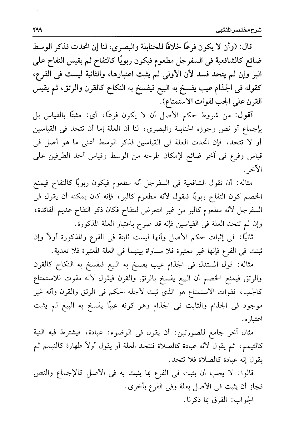 قال: (وأن لا يكون فرعًا خلافًا للحنابلة والبصرى، لنا إن اتحدت فذكر الوسط ضائع كالشافعية فى السفرجل مطعوم فيكون ربويًا كالتفاح ثم يقيس التفاح على البر وإن لم يتحد فسد لأن الأولى لم يثبت اعتبارها، والثانية ليست فى الفرع، كقوله فى الجذام عيب يفسخ به البيع فيفسخ به النكاح كالقرن والرتق، ثم يقيس القرن على الجب لفوات الاستمتاع).
