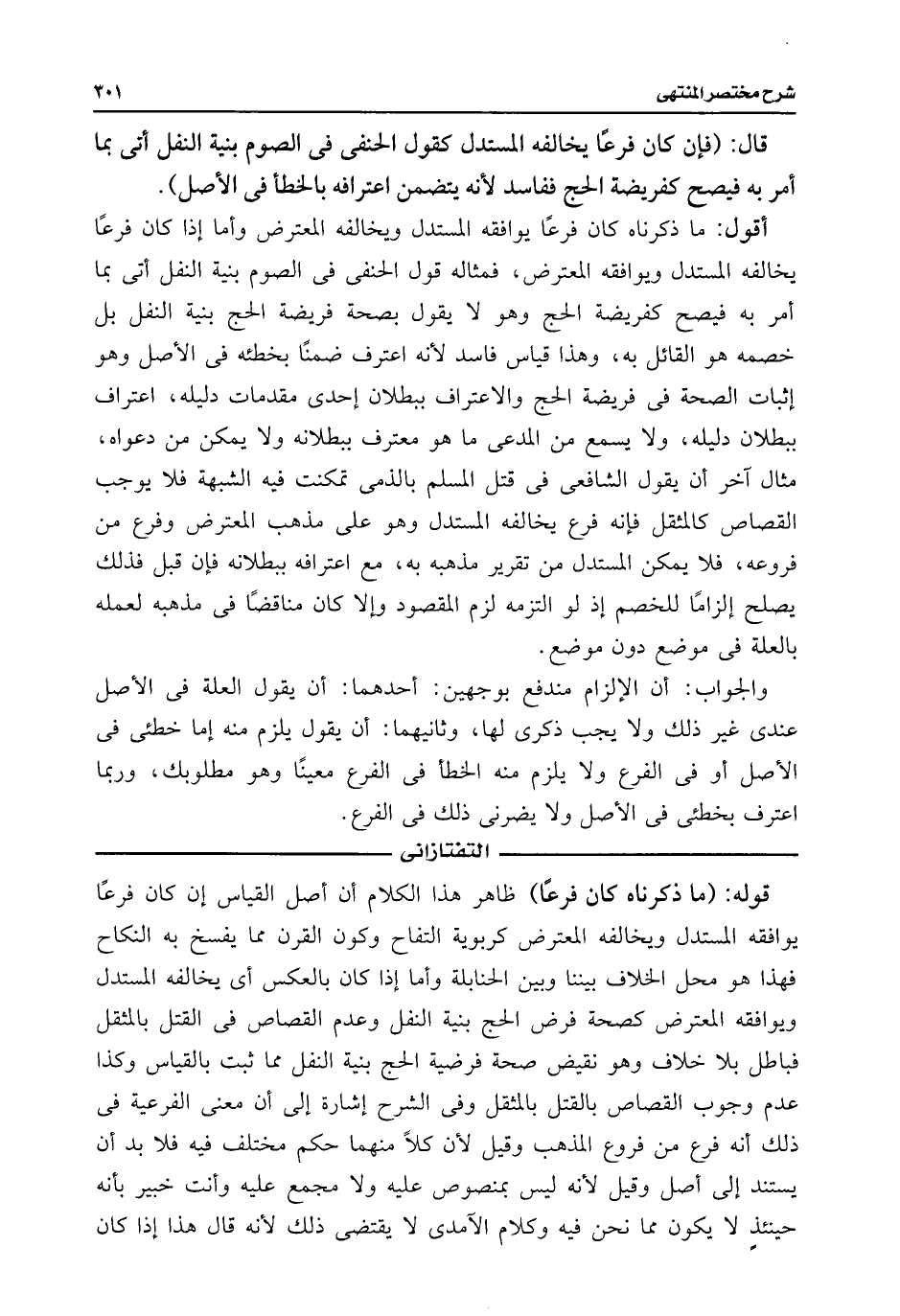 أقول: ما ذكرناه كان فرعًا يوافقه المستدل ويخالفه المعترض وأما إذا كان فرعًا يخالفه المستدل ويوافقه المعترض، فمثاله قول الحنفى فى الصوم بنية النفل أتى بما أمر به فيصح كفريضة الحج وهو لا يقول بصحة فريضة الحج بنية النفل بل خصمه هو القائل به، وهذا قياس فاسد لأنه اعترف ضمنًا بخطئه فى الأصل وهو إثبات الصحة فى فريضة الحج والاعتراف ببطلان إحدى مقدمات دليله، اعتراف ببطلان دليله، ولا يسمع من المدعى ما هو معترف ببطلانه ولا يمكن من دعواه، مثال آخر أن يقول الشافعى فى قتل المسلم بالذمى تمكنت فيه الشبهة فلا يوجب القصاص كالمثقل فإنه فرع يخالفه المستدل وهو على مذهب المعترض وفرع من فروعه، فلا يمكن المستدل من تقرير مذهبه به، مع اعترافه ببطلانه فإن قبل فذلك يصلح إلزامًا للخصم إذ لو التزمه لزم المقصود وإلا كان مناقضًا فى مذهبه لعمله بالعلة فى موضع دون موضع.