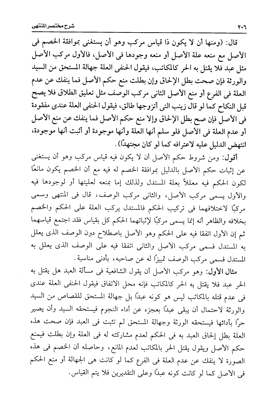 قال: (ومنها أن لا يكون ذا قياس مركب وهو أن يستغنى بموافقة الخصم فى الأصل مع منعه علة الأصل أو منعه وجودها فى الأصل، فالأول مركب الأصل مثل عبد فلا يقتل به الحر كالمكاتب، فيقول الحنفى العلة جهالة المستحق من السيد والورثة فإن صحت بطل الإلحاق وإن بطلت منع حكم الأصل فما ينفك عن عدم العلة فى الفرع أو منع الأصل الثانى مركب الوصف مثل تعليق الطلاق فلا يصح قبل النكاح كما لو قال زينب التى أتزوجها طالق، فيقول الحنفى العلة عندى مفقودة فى الأصل فإن صح بطل الإلحاق وإلا منع حكم الأصل فما ينفك عن منع الأصل أو عدم العلة فى الأصل فلو سلم أنها العلة وأنها موجودة أو أثبت أنها موجودة، انتهض الدليل عليه لاعترافه كما لو كان مجتهدًا).