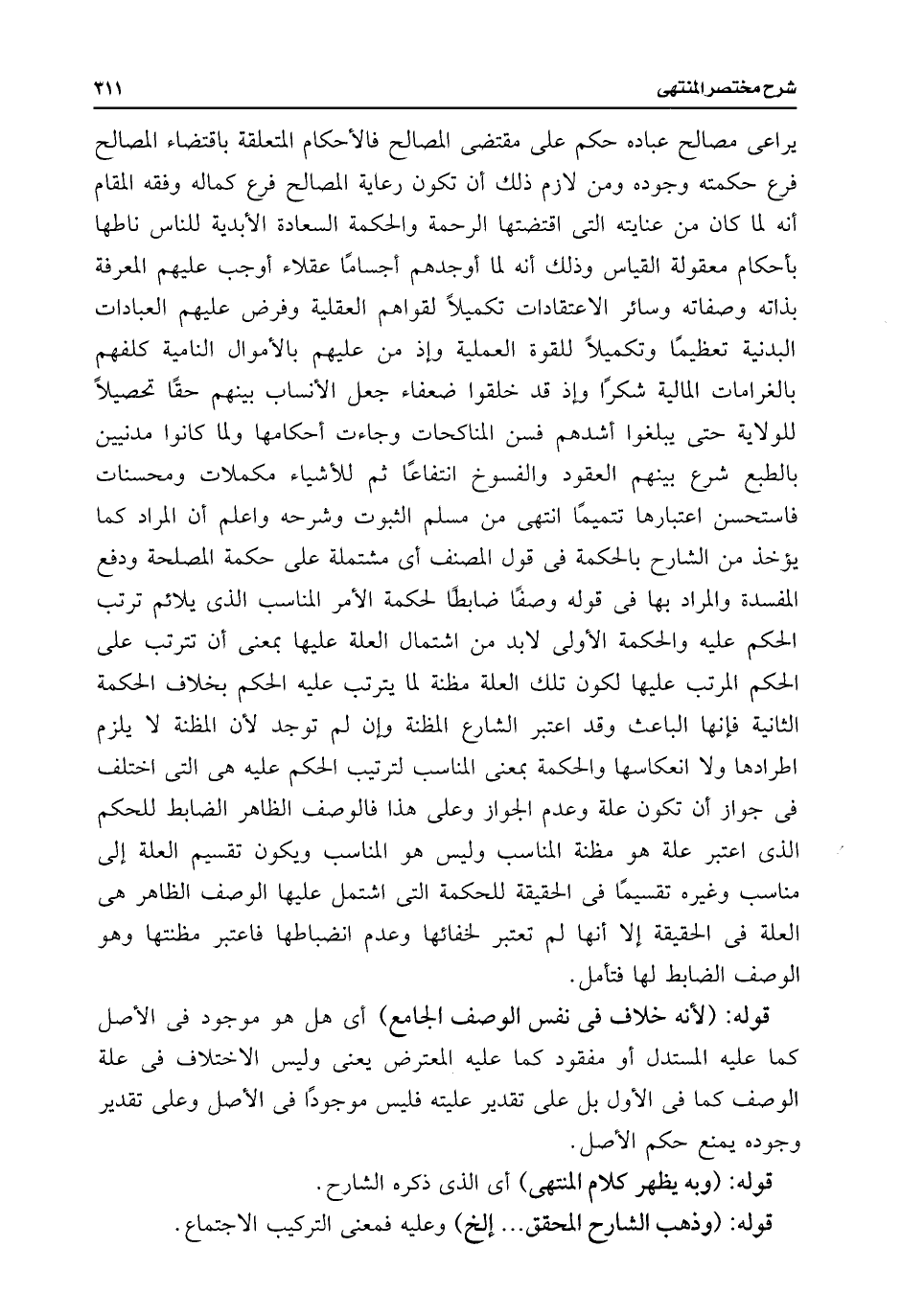 يراعى مصالح عباده حكم على مقتضى الصالح فالأحكام المتعلقة باقتضاء المصالح فرع حكمته وجوده ومن لازم ذلك أن تكون رعاية الصالح فرع كماله وفقه المقام أنه لما كان من عنايته التى اقتضتها الرحمة والحكمة السعادة الأبدية للناس ناطها بأحكام معقولة القياس وذلك أنه لما أوجدهم أجسامًا عقلاء أوجب عليهم المعرفة بذاته وصفاته وسائر الاعتقادات تكميلًا لقواهم العقلية وفرض عليهم العبادات البدنية تعظيمًا وتكميلًا للقوة العملية وإذ من عليهم بالأموال النامية كلفهم بالغرامات المالية شكرًا وإذ قد خلقوا ضعفاء جعل الأنساب بينهم حقًا تحصيلًا للولاية حتى يبلغوا أشدهم فسن المناكحات وجاءت أحكامها ولما كانوا مدنيين بالطبع شرع بينهم العقود والفسوخ انتفاعًا ثم للأشياء مكملات ومحسنات فاستحسن اعتبارها تتميمًا انتهى من مسلم الثبوت وشرحه واعلم أن المراد كما يؤخذ من الشارح بالحكمة فى قول المصنف أى مشتملة على حكمة المصلحة ودفع المفسدة والمراد بها فى قوله وصفًا ضابطًا لحكمة الأمر المناسب الذى يلائم ترتب الحكم عليه والحكمة الأولى لابد من اشتمال العلة عليها بمعنى أن تترتب على الحكم المرتب عليها لكون تلك العلة مظنة لما يترتب عليه الحكم بخلاف الحكمة الثانية فإنها الباعث وقد اعتبر الشارع المظنة وإن لم توجد لأن المظنة لا يلزم اطرادها ولا انعكاسها والحكمة بمعنى المناسب لترتيب الحكم عليه هى التى اختلف فى جواز أن تكون علة وعدم الجواز وعلى هذا فالوصف الظاهر الضابط للحكم الذى اعتبر علة هو مظنة المناسب وليس هو المناسب ويكون تقسيم العلة إلى مناسب وغيره تقسيمًا فى الحقيقة للحكمة التى اشتمل عليها الوصف الظاهر هى العلة فى الحقيقة إلا أنها لم تعتبر لخفائها وعدم انضباطها فاعتبر مظنتها وهو الوصف الضابط لها فتأمل.