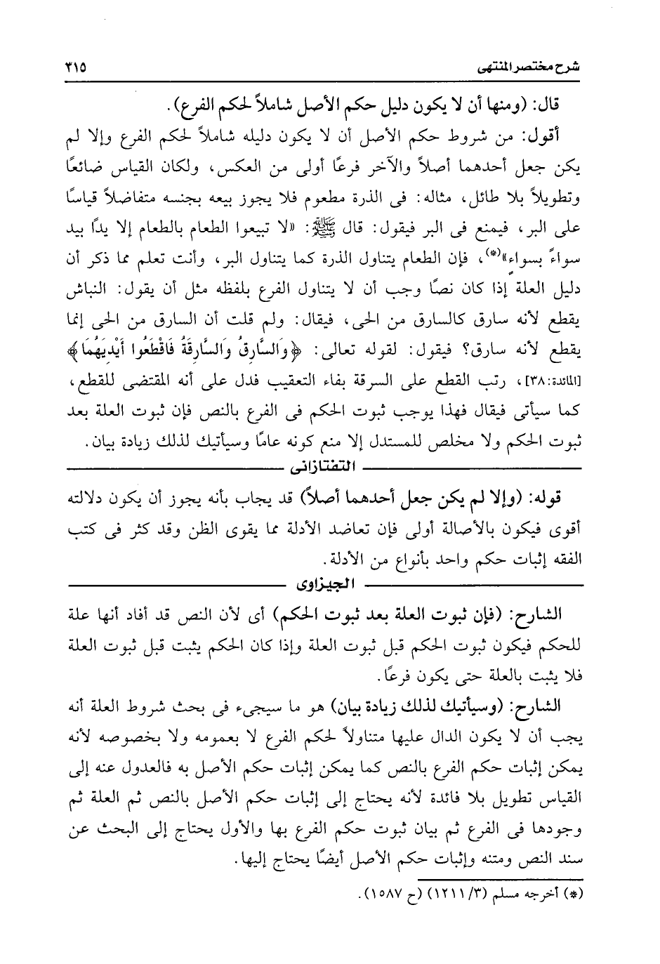 أقول: من شروط حكم الأصل أن لا يكون دليله شاملًا لحكم الفرع وإلا لم يكن جعل أحدهما أصلًا والآخر فرعًا أولى من العكس، ولكان القياس ضائعًا وتطويلًا بلا طائل، مثاله: فى الذرة مطعوم فلا يجوز بيعه بجنسه متفاضلًا قياسًا على البر، فيمنع فى البر فيقول: قال -صلى اللَّه عليه وسلم-: "لا تبيعوا الطعام بالطعام إلا يدًا بيد سواءً بسواءٍ" (*)، فإن الطعام يتناول الذرة كما يتناول البر، وأنت تعلم مما ذكر أن دليل العلة إذا كان نصًا وجب أن لا يتناول الفرع بلفظه مثل أن يقول: النباش يقطع لأنه سارق كالسارق من الحى، فيقال: ولم قلت أن السارق من الحى إنما يقطع لأنه سارق؟ فيقول: لقوله تعالى: {وَالسَّارِقُ وَالسَّارِقَةُ فَاقْطَعُوا أَيْدِيَهُمَا} [المائدة: ٣٨]، رتب القطع على السرقة بفاء التعقيب فدل على أنه المقتضى للقطع، كما سيأتى فيقال فهذا يوجب ثبوت الحكم فى الفرع بالنص فإن ثبوت العلة بعد ثبوت الحكم ولا مخلص للمستدل إلا منع كونه عامًا وسيأتيك لذلك زيادة بيان.