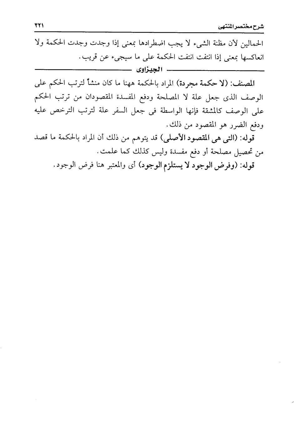 المصنف: (لا حكمة مجردة) المراد بالحكمة ههنا ما كان منشأ لترتب الحكم على الوصف الذى جعل علة لا المصلحة ودفع المفسدة المقصودان من ترتب الحكم على الوصف كالمشقة فإنها الواسطة فى جعل السفر علة لترتب الترخص عليه ودفع الضرر هو المقصود من ذلك.