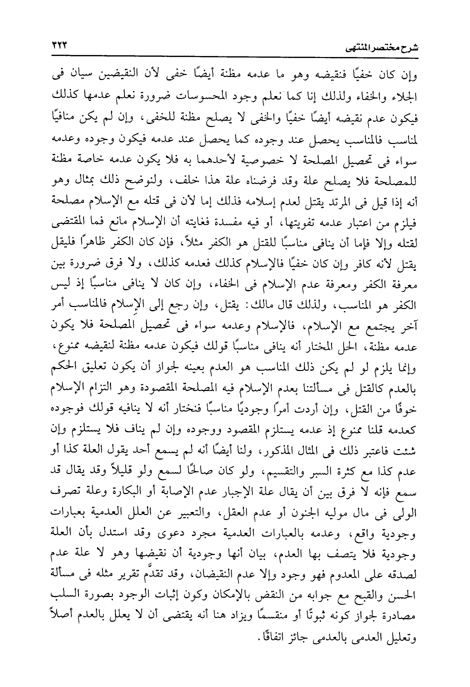 وإن كان خفيًا فنقيضه وهو ما عدمه مظنة أيضًا خفى لأن النقيضين سيان فى الجلاء والخفاء ولذلك إنا كما نعلم وجود المحسوسات ضرورة نعلم عدمها كذلك فيكون عدم نقيضه أيضًا خفيًا والخفى لا يصلح مظنة للخفى، وإن لم يكن منافيًا لمناسب فالمناسب يحصل عند وجوده كما يحصل عند عدمه فيكون وجوده وعدمه سواء فى تحصيل المصلحة لا خصوصية لأحدهما به فلا يكون عدمه خاصة مظنة للمصلحة فلا يصلح علة وقد فرضناه علة هذا خلف، ولنوضح ذلك بمثال وهو أنه إذا قيل فى المرتد يقتل لعدم إسلامه فذلك إما لأن فى قتله مع الإسلام مصلحة فيلزم من اعتبار عدمه تفويتها، أو فيه مفسدة فغايته أن الإسلام مانع فما المقتضى لقتله وإلا فإما أن ينافى مناسبًا للقتل هو الكفر مثلًا، فإن كان الكفر ظاهرًا فليقل يقتل لأنه كافر وإن كان خفيًا فالإسلام كذلك فعدمه كذلك، ولا فرق ضرورة بين معرفة الكفر ومعرفة عدم الإسلام فى الخفاء، وإن كان لا ينافى مناسبًا إذ ليس الكفر هو المناسب، ولذلك قال مالك: يقتل، وإن رجع إلى الإسلام فالمناسب أمر آخر يجتمع مع الإسلام، فالإسلام وعدمه سواء فى تحصيل المصلحة فلا يكون عدمه مظنة، الحل المختار أنه ينافى مناسبًا قولك فيكون عدمه مظنة لنقيضه ممنوع، وإنما يلزم لو لم يكن ذلك المناسب هو العدم بعينه لجواز أن يكون تعليق الحكم بالعدم كالقتل فى مسألتنا بعدم الإسلام فيه المصلحة المقصودة وهو التزام الإسلام خوفًا من القتل، وإن أردت أمرًا وجوديًا مناسبًا فنختار أنه لا ينافيه قولك فوجوده كعدمه قلنا ممنوع إذ عدمه يستلزم المقصود ووجوده وإن لم يناف فلا يستلزم وإن شئت فاعتبر ذلك فى المثال المذكور، ولنا أيضًا أنه لم يسمع أحد يقول العلة كذا أو عدم كذا مع كثرة السبر والتقسيم، ولو كان صالحًا لسمع ولو قليلًا وقد يقال قد سمع فإنه لا فرق بين أن يقال علة الإجبار عدم الإصابة أو البكارة وعلة تصرف الولى فى مال موليه الجنون أو عدم العقل، والتعبير عن العلل العدمية بعبارات وجودية واقع، وعدمه بالعبارات العدمية مجرد دعوى وقد استدل بأن العلة وجودية فلا يتصف بها العدم، بيان أنها وجودية أن نقيضها وهو لا علة عدم لصدقه على المعدوم فهو وجود وإلا عدم النقيضان، وقد تقدَّم تقرير مثله فى مسألة الحسن والقبح مع جوابه من النقض بالإمكان وكون إثبات الوجود بصورة السلب مصادرة لجواز كونه ثبوتًا أو منقسمًا ويزاد هنا أنه يقتضى أن لا يعلل بالعدم أصلًا وتعليل العدمى بالعدمى جائز اتفاقًا.