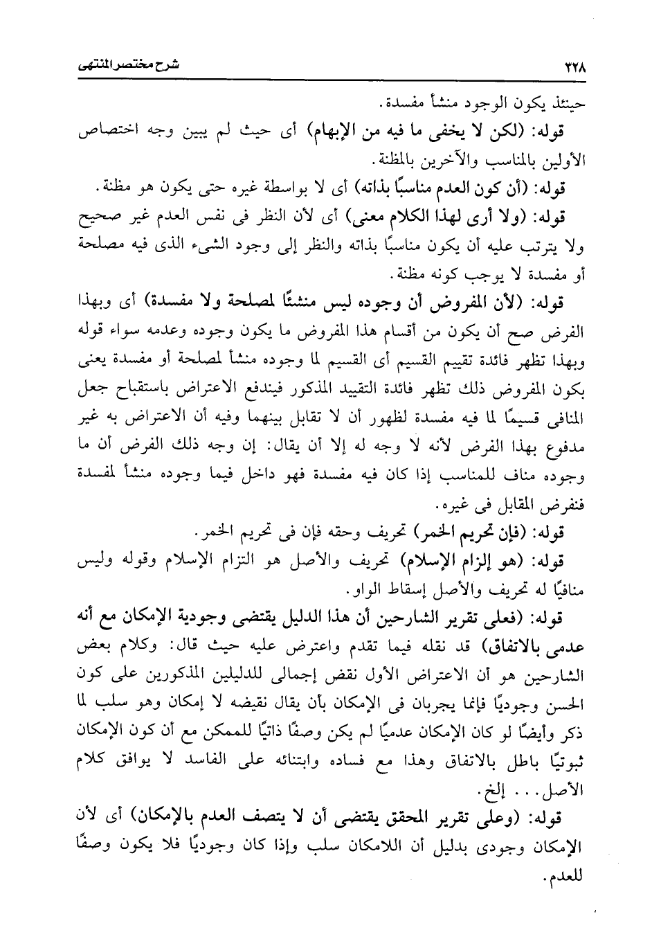 قوله: (فعلى تقرير الشارحين أن هذا الدليل يقتضى وجودية الإمكان مع أنه عدمى بالاتفاق) قد نقله فيما تقدم واعترض عليه حيث قال: وكلام بعض الشارحين هو أن الاعتراض الأول نقض إجمالى للدليلين المذكورين على كون الحسن وجوديًا فإنما يجربان فى الإمكان بأن يقال نقيضه لا إمكان وهو سلب لما ذكر وأيضًا لو كان الإمكان عدميًا لم يكن وصفًا ذاتيًا للممكن مع أن كون الإمكان ثبوتيًا باطل بالاتفاق وهذا مع فساده وابتنائه على الفاسد لا يوافق كلام الأصل. . . إلخ.