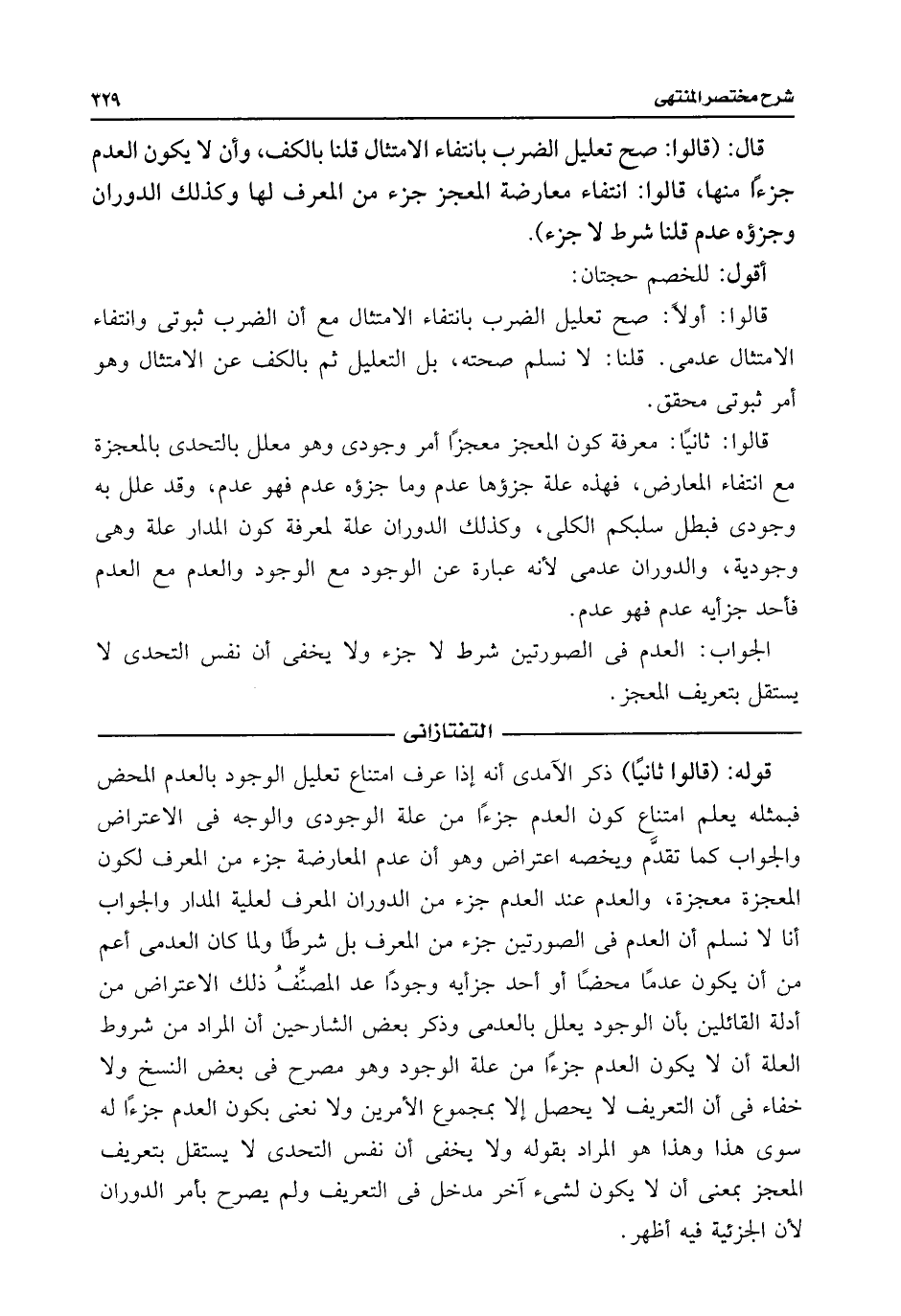 قوله: (قالوا ثانيًا) ذكر الآمدى أنه إذا عرف امتناع تعليل الوجود بالعدم المحض فبمثله يعلم امتناع كون العدم جزءًا من علة الوجودى والوجه فى الاعتراض والجواب كما تقدَّم ويخصه اعتراض وهو أن عدم المعارضة جزء من المعرف لكون المعجزة معجزة، والعدم عند العدم جزء من الدوران المعرف لعلية المدار والجواب أنا لا نسلم أن العدم فى الصورتين جزء من المعرف بل شرطًا ولما كان العدمى أعم من أن يكون عدمًا محضًا أو أحد جزأيه وجودًا عد المصنِّفُ ذلك الاعتراض من أدلة القائلين بأن الوجود يعلل بالعدمى وذكر بعض الشارحين أن المراد من شروط العلة أن لا يكون العدم جزءًا من علة الوجود وهو مصرح فى بعض النسخ ولا خفاء فى أن التعريف لا يحصل إلا بمجموع الأمرين ولا نعنى بكون العدم جزءا له سوى هذا وهذا هو المراد بقوله ولا يخفى أن نفس التحدى لا يستقل بتعريف المعجز بمعنى أن لا يكون لشئ آخر مدخل فى التعريف ولم يصرح بأمر الدوران لأن الجزئية فيه أظهر.