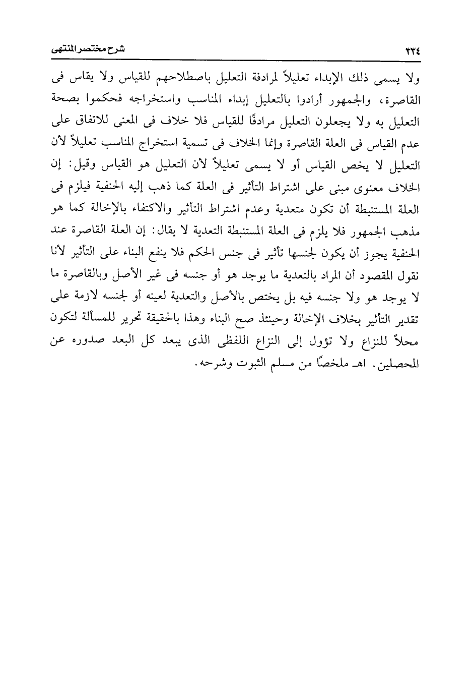 ولا يسمى ذلك الإبداء تعليلًا لمرادفة التعليل باصطلاحهم للقياس ولا يقاس فى القاصرة، والجمهور أرادوا بالتعليل إبداء المناسب واستخراجه فحكموا بصحة التعليل به ولا يجعلون التعليل مرادفًا للقياس فلا خلاف فى المعنى للاتفاف على عدم القياس فى العلة القاصرة وإنما الخلاف فى تسمية استخراج المناسب تعليلًا لأن التعليل لا يخص القياس أو لا يسمى تعليلًا لأن التعليل هو القياس وقيل: إن الخلاف معنوى مبنى على اشتراط التأثير فى العلة كما ذهب إليه الحنفية فيلزم فى العلة المستنبطة أن تكون متعدية وعدم اشتراط التأثير والاكتفاء بالإخالة كما هو مذهب الجمهور فلا يلزم فى العلة المستنبطة التعدية لا يقال: إن العلة القاصرة عند الحنفية يجوز أن يكون لجنسها تأثير فى جنس الحكم فلا ينفع البناء على التأثير لأنا نقول المقصود أن المراد بالتعدية ما يوجد هو أو جنسه فى غير الأصل وبالقاصرة ما لا يوجد هو ولا جنسه فيه بل يختص بالأصل والتعدية لعينه أو لجنسه لازمة على تقدير التأثير بخلاف الإخالة وحينئذ صح البناء وهذا بالحقيقة تحرير للمسألة لتكون محلًا للنزاع ولا تؤول إلى النزاع اللفظى الذى يبعد كل البعد صدوره عن المحصلين. اهـ ملخصًا من مسلم الثبوت وشرحه.