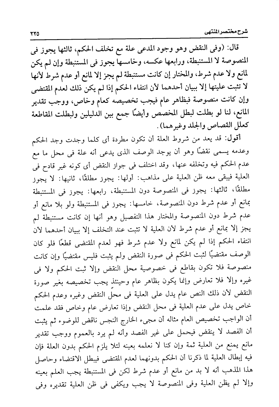 أقول: قد يعد من شروط العلة أن تكون مطردة أى كلما وجدت وجد الحكم وعدمه يسمى نقضًا وهو أن يوجد الوصف الذى يدعى أنه علة فى محل ما مع عدم الحكم فيه وتخلفه عنها، وقد اختلف فى جواز النقض أى كونه غير قادح فى العلية فيبقى معه ظن العلية على مذاهب: أولها: يجوز مطلقًا، ثانيها: لا يجوز مطلقًا، ثالثها: يجوز فى المنصوصة دون المستنبطة، رابعها: يجوز فى المستنبطة بمانع أو عدم شرط دون المنصوصة، خامسها: يجوز فى المستنبطة ولو بلا مانع أو عدم شرط دون المنصوصة والمختار هذا التفصيل وهو أنها إن كانت مستنبطة لم يجز إلا بمانع أو عدم شرط لأن العلية لا تثبت عند التخلف إلا ببيان أحدهما لأن انتفاء الحكم إذا لم يكن لمانع ولا عدم شرط فهو لعدم المقتضى قطعًا فلو كان الوصف مقتضيًا لثبت الحكم فى صورة النقض ولم يثبت فليس مقتضيًا وإن كانت منصوصة فلا تكون بقاطع فى خصوصية محل النقض وإلا ثبت الحكم ولا فى غيره وإلا فلا تعارض وانما يكون بظاهر عام وحينئذٍ يجب تخصيصه بغير صورة النقض لأن ذلك النص عام يدل على العلية فى محل النقض وغيره وعدم الحكم خاص يدل على عدم العلية فى محل النقض وإذا تعارض عام وخاص فقد علمت أن الواجب تخصيص العام مثاله أن مجئ الخارج النجس ناقض للوضوء ثم يثبت أن الفصد لا ينقض فيحمل على غير الفصد وأنه لم يرد بالعموم ووجب تقدير مانع يمنع من العلية ثمة وإن كنا لا نعلمه بعينه لئلا يلزم الحكم بدون العلة فإن فيه إبطال العلية لما ذكرنا أن الحكم بدونهما لعدم المقتضى فيبطل الاقتضاء وحاصل هذا المذهب أنه لا بد من مانع أو عدم شرط لكن فى المستنبطة يجب العلم بعينه وإلا لم يظن العلية وفى المنصوصة لا يجب ويكفى فى ظن العلية تقديره وفى