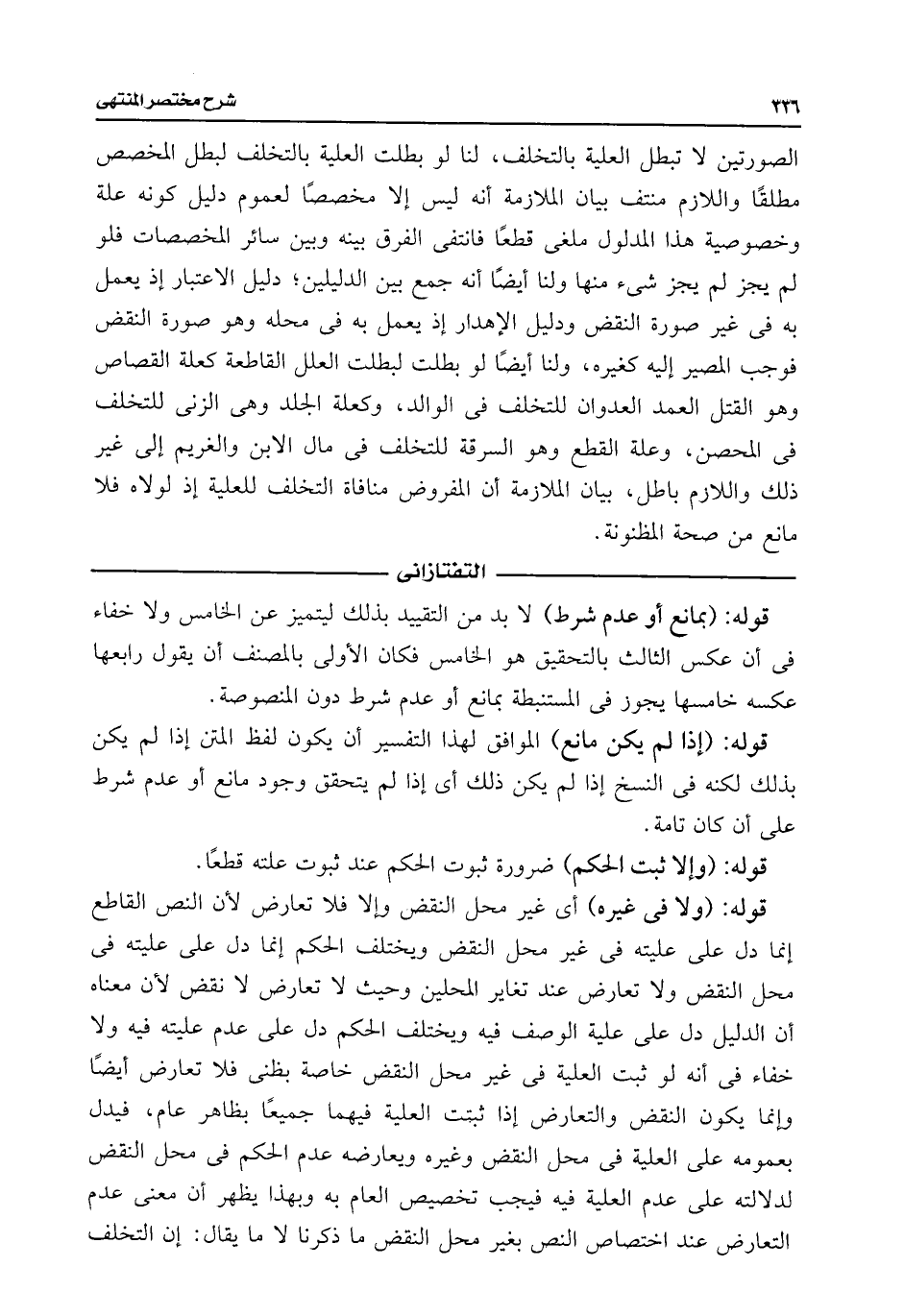 قوله: (ولا فى غيره) أى غير محل النقض وإلا فلا تعارض لأن النص القاطع إنما دل على عليته فى غير محل النقض ويختلف الحكم إنما دل على عليته فى محل النقض ولا تعارض عند تغاير المحلين وحيث لا تعارض لا نقض لأن معناه أن الدليل دل على علية الوصف فيه ويختلف الحكم دل على عدم عليته فيه ولا خفاء فى أنه لو ثبت العلية فى غير محل النقض خاصة بظنى فلا تعارض أيضًا وإنما يكون النقض والتعارض إذا ثبتت العلية فيهما جميعًا بظاهر عام، فيدل بعمومه على العلية فى محل النقض وغيره ويعارضه عدم الحكم فى محل النقض لدلالته على عدم العلية فيه فيجب تخصيص العام به وبهذا يظهر أن معنى عدم التعارض عند اختصاص النص بغير محل النقض ما ذكرنا لا ما يقال: إن التخلف