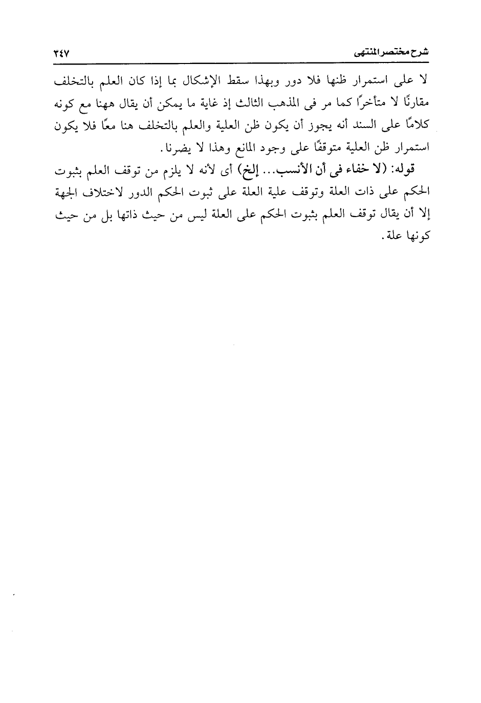 لا على استمرار ظنها فلا دور وبهذا سقط الإشكال بما إذا كان العلم بالتخلف مقارنًا لا متأخرًا كما مر فى المذهب الثالث إذ غاية ما يمكن أن يقال ههنا مع كونه كلامًا على السند أنه يجوز أن يكون ظن العلية والعلم بالتخلف هنا معًا فلا يكون استمرار ظن العلية متوقفًا على وجود المانع وهذا لا يضرنا.