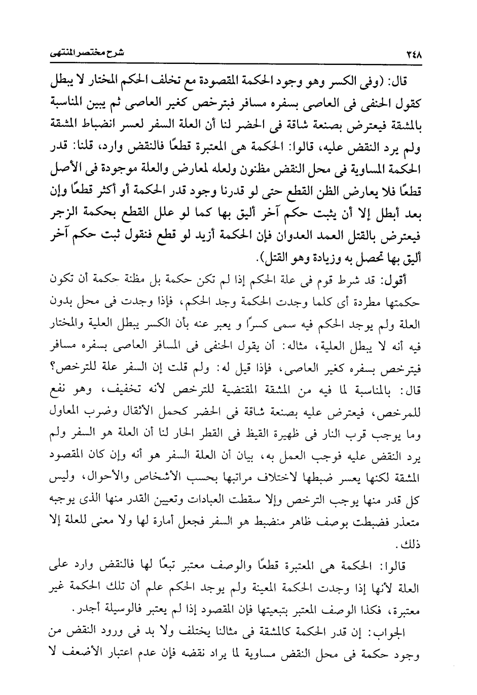 أقول: قد شرط قوم فى علة الحكم إذا لم تكن حكمة بل مظنة حكمة أن تكون حكمتها مطردة أى كلما وجدت الحكمة وجد الحكم، فإذا وجدت فى محل بدون العلة ولم يوجد الحكم فيه سمى كسرًا ويعبر عنه بأن الكسر يبطل العلية والمختار فيه أنه لا يبطل العلية، مثاله: أن يقول الحنفى فى المسافر العاصى بسفره مسافر فيترخص بسفره كغير العاصى، فإذا قيل له: ولم قلت إن السفر علة للترخص؟ قال: بالمناسبة لما فيه من المشقة المقتضية للترخص لأنه تخفيف، وهو نفع للمرخص، فيعترض عليه بصنعة شاقة فى الحضر كحمل الأثقال وضرب المعاول وما يوجب قرب النار فى ظهيرة القيظ فى القطر الحار لنا أن العلة هو السفر ولم يرد النقض عليه فوجب العمل به، بيان أن العلة السفر هو أنه وإن كان المقصود المشقة لكنها يعسر ضبطها لاختلاف مراتبها بحسب الأشخاص والأحوال، وليس كل قدر منها يوجب الترخص وإلا سقطت العبادات وتعيين القدر منها الذى يوجبه متعذر فضبطت بوصف ظاهر منضبط هو السفر فجعل أمارة لها ولا معنى للعلة إلا ذلك.