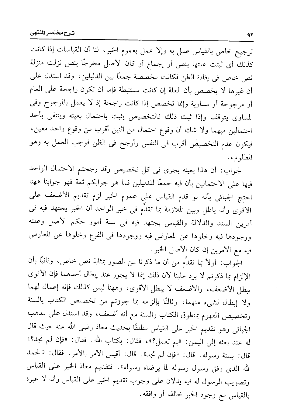 الجواب: أن هذا بعينه يجرى فى كل تخصيص وقد رجحتم الاحتمال الواحد فيها على الاحتمالين بأن فيه جمعًا للدليلين فما هو جوابكم ثمة فهو جوابنا ههنا احتج الجبائى بأنه لو قدم القياس على عموم الخبر لزم تقديم الأضعف على الأقوى وأنه باطل وبين الملازمة بما تقدَّم فى خبر الواحد أن الخبر يجتهد فيه فى أمرين السند والدلالة والقياس يجتهد فيه فى ستة أمور حكم الأصل وعلته ووجودها فيه وخلوها عن العارض فيه ووجودها فى الفرع وخلوها عن المعارض فيه مع الأمرين إن كان الأصل الخبر.
