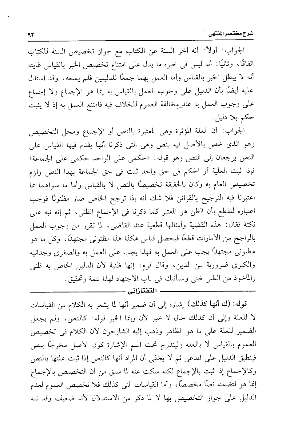 الجواب: أن العلة المؤثرة وهى المعتبرة بالنص أو الإجماع ومحل التخصيص وهو الذى خص بالأصل فيه بنص وهى التى ذكرنا أنها يقدم فيها القياس على النص يرجعان إلى النص وهو قوله: "حكمى على الواحد حكمى على الجماعة" فإذا ثبت العلية أو الحكم فى حق واحد ثبت فى حق الجماعة بهذا النص ولزم تخصيص العام به وكان بالحقيقة تخصيصًا بالنص لا بالقياس وأما ما سواهما مما اعتبرنا فيه الترجيح بالقرائن فلا شك أنه إذا ترجح الخاص صار مظنونًا فوجب اعتباره للقطع بأن الظن هو المعتبر كما ذكرنا فى الإجماع الظنى، ثم إنه نبه على نكتة فقال: هذه القضية وأمثالها قطعية عند القاضى، لما تقرر من وجوب العمل بالراجح من الأمارات قطعًا فيحصل قياس هكذا هذا مظنونى مجتهدًا، وكل ما هو مظنونى مجتهدًا يجب على العمل به فهذا يجب على العمل به والصغرى وجدانية والكبرى ضرورية من الدين، وقال قوم: إنها ظنية لأن الدليل الخاص به ظنى والمأخوذ من الظنى ظنى وسيأتيك فى باب الاجتهاد لهذا تتمة وتحقيق.