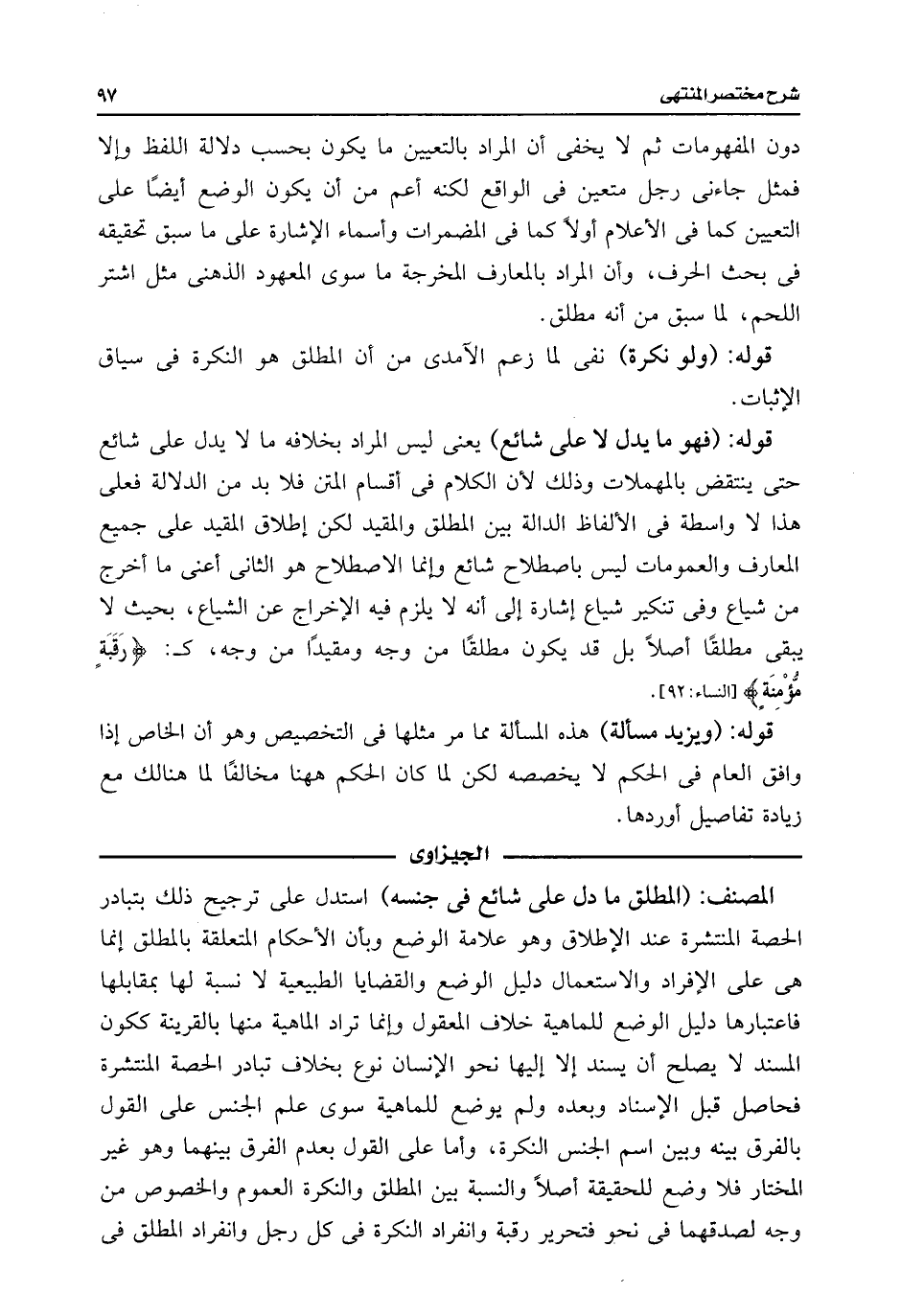 المصنف: (المطلق ما دل على شائع فى جنسه) استدل على ترجيح ذلك بتبادر الحصة المنتشرة عند الإطلاق وهو علامة الوضع وبأن الأحكام المتعلقة بالمطلق إنما هى على الإفراد والاستعمال دليل الوضع والقضايا الطبيعية لا نسبة لها بمقابلها فاعتبارها دليل الوضع للماهية خلاف المعقول وإنما تراد الماهية منها بالقرينة ككون المسند لا يصلح أن يسند إلا إليها نحو الإنسان نوع بخلاف تبادر الحصة المنتشرة فحاصل قبل الإسناد وبعده ولم يوضع للماهية سوى علم الجنس على القول بالفرق بينه وبين اسم الجنس النكرة، وأما على القول بعدم الفرق بينهما وهو غير المختار فلا وضع للحقيقة أصلًا والنسبة بين المطلق والنكرة العموم والخصوص من وجه لصدقهما فى نحو فتحرير رقبة وانفراد النكرة فى كل رجل وانفراد المطلق فى