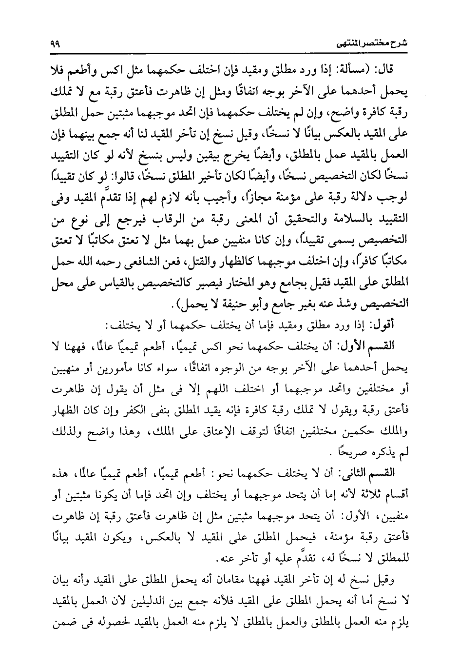 القسم الثانى: أن لا يختلف حكمهما نحو: أطعم تميميًا، أطعم تميميًا عالمًا، هذه أقسام ثلاثة لأنه إما أن يتحد موجبهما أو يختلف وإن اتحد فإما أن يكونا مثبتين أو منفيين، الأول: أن يتحد موجبهما مثبتين مثل إن ظاهرت فأعتق رقبة إن ظاهرت فأعتق رقبة مؤمنة، فيحمل المطلق على المقيد لا بالعكس، ويكون المقيد بيانًا للمطلق لا نسخًا له، تقدَّم عليه أو تأخر عنه.