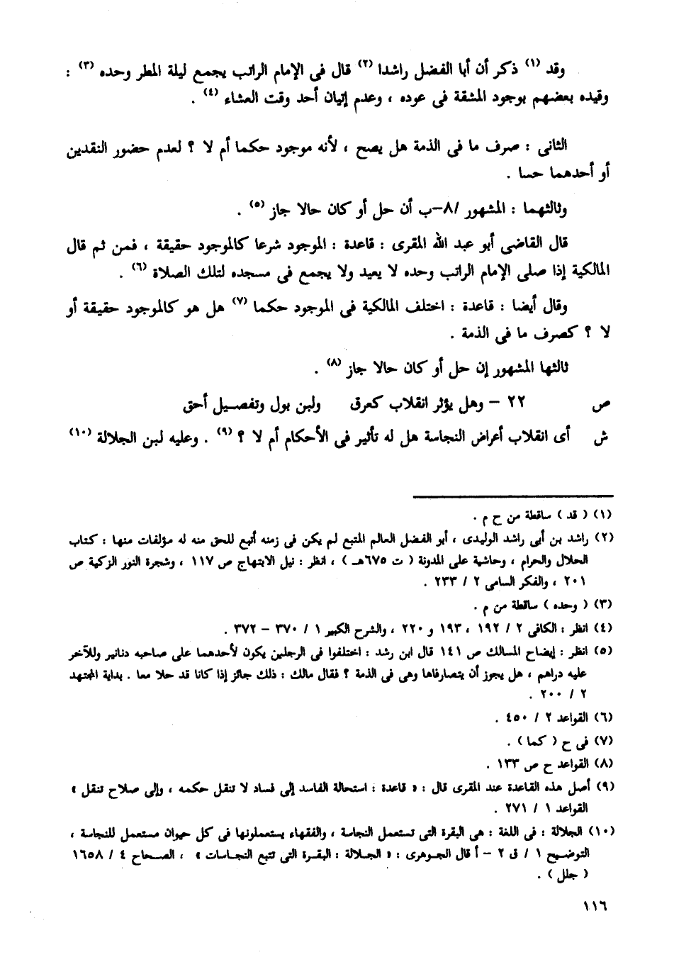 قال القاضي أبو عبد الله المقري: قاعدة: الموجود شرعا كالموجود حقيقة، فمن ثم قال المالكية إذا صلي الإمام الراتب وحده لا يعيد ولا يجمع في مسجده لتلك الصلاة.