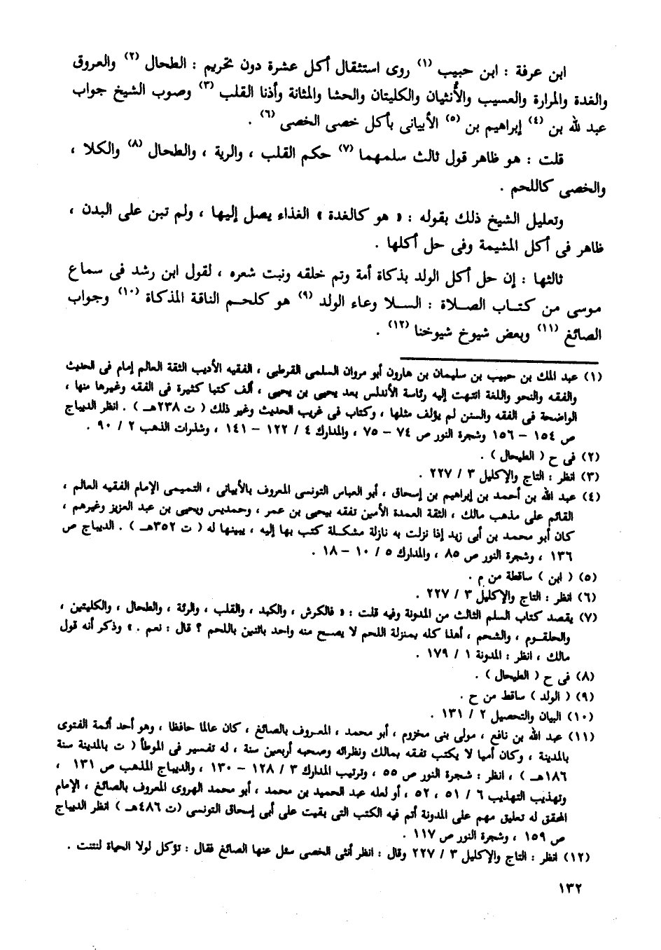 ابن عرفة: ابن حبيب روي استثقال أكل عشرة دون تحريم: الطحال والعروق والغدة والمرارة والعسيب والأنثيان والكليتان والحشا والمثانة وأذناه القلب وصوب الشيخ جواب عبد الله بن إبراهيم بن الأبياني بأكل خصي الخصي.