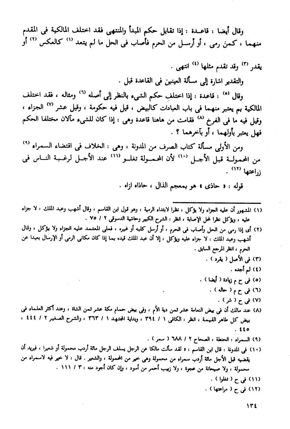 وقال أيضا: قاعدة: إذا تقابل حكم المبدأ والمنتهي فقد اختلف المالكية في المقدم منهما، كمن رمي، أو أرسل من الحرم فأصاب في الحل ما لم يتعد كالعكس أو يقدر وقد تقدم مثلها انتهي.