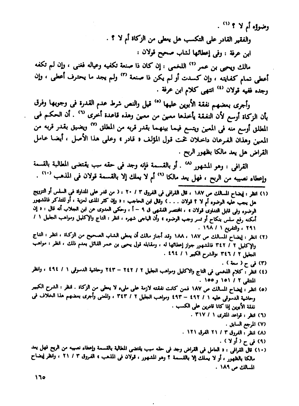 القرافي: وهو المشهور. أو بالقسمة فإنه وجد في حقه سبب يقتضي المطالبة بالقسمة وإعطاء نصيبه من الربح، فهل يعد مالكاً أم لا يملك إلا بالقسمة قولان في المذهب.