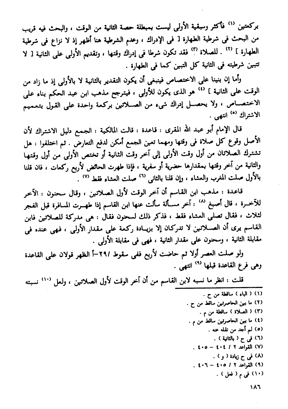قاعدة: مذهب ابن القاسم أن آخر الوقت لأول الصلاتين، وقال سحنون: الآخر للآخرة، قال أصبغ: آخر مسألة سألت عنها ابن القاسم إذا ظهرت المسافرة قبل الفجر لثلاث، فقال تصلى العشاء فقط، فذكر ذلك لسحنون فقال: هى مدركة للصلاتين فابن القاسم يرى أن الصلاتين لا تدركان إلا بزيادة ركعة على مقدار الأولى، فهى عنده فى مقابلة الثانية، وسحنون على مقدار الثانية، فهى فى مقابلة الأولى.
