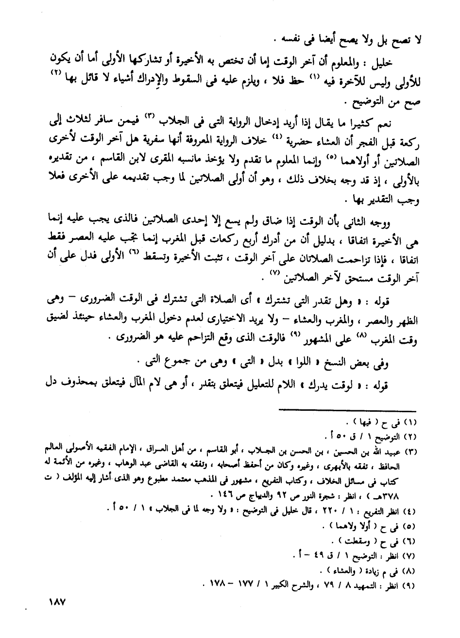 خليل: والمعلوم أن آخر الوقت إما أن تختص به الأخيرة أو تشاركها الأولى أما أن يكون للأولى وليس للآخرة فيه حظ فلا، ويلزم عليه فى السقوط والإدراك أشياء لا قائل بها صح من التوضيح.