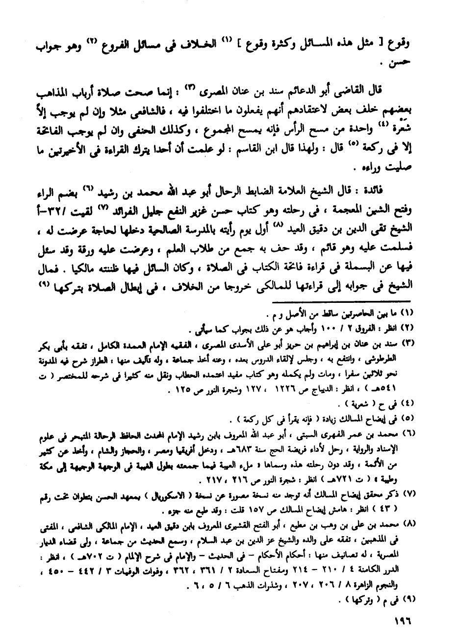 فائدة: قال الشيخ العلامة الضابط الرحال أبو عبد الله محمد بن رشيد بضم الراء وفتح الشين المعجمة، فى رحلته وهو كتاب حسن غزير النفع جليل الفرائد لقيت/ 32 - أالشيخ تقى الدين بن دقيق العيد أول يوم رأيته بالمدرسة الصالحية دخلها لحاجة عرضت له، فسلمت عليه وهو قائم، وقد حف به جمع من طلاب العلم، وعرضت عليه ورقة وقد سئل فيها عن البسملة فى قراءة فاتحة الكتاب فى الصلاة، وكان السائل فيها ظننته مالكيا. فمال الشيخ فى جوابه إلى قراءتها للمالكى خروجا من الخلاف، فى إبطال الصلاة بتركها