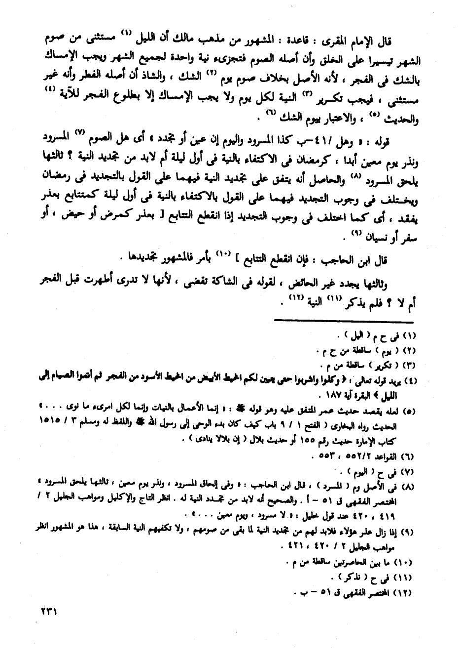 قال الإمام المقري: قاعدة: المشهور من مذهب مالك أن الليل مستثنى من صوم الشهر تيسيرًا على الخلق وأن أصله الصوم فتجزئ نية واحدة لجميع الشهر ويجب الإمساك بالشك فى الفجر، لأنه الأصل بخلاف صوم يوم الشك، والشاذ أن أصله الفطر وأنه غير مستثنى، فيجب تكرير النية لكل يوم ولا يجب الإمساك إلا بطلوع الفجر للآية والحديث، والاعتبار بيوم الشك.