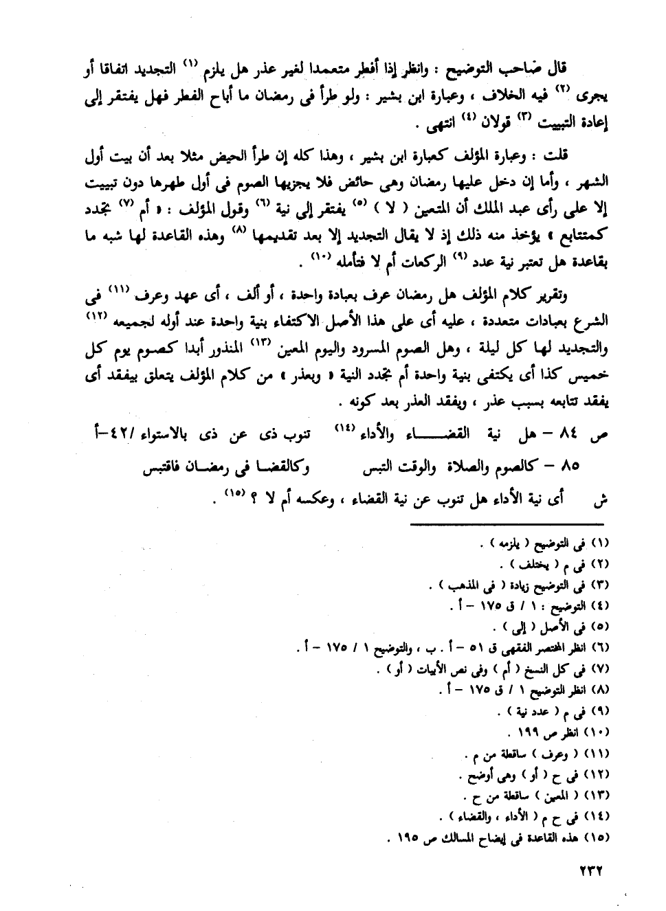 قلت: وعبارة المؤلف كعبارة ابن بشير، وهذا كله إن طرأ الحيض مثلا بعد أن بيت أول الشهر، وأما إن دخل عليها رمضان وهى حائض فلا يجزيها الصوم فى أول طهرها دون تبييت إلا على رأى عبد الملك أن المتعين (لا) يفتقر إلى نية وقول المؤلف: "أم تجدد كمتتابع" يؤخذ منه ذلك إذ لا يقال التجديد إلا بعد تقديمها وهذه القاعدة لها شبه ما بقاعدة هل تعتبر نية عدد الركعات أم لا فتأمله.