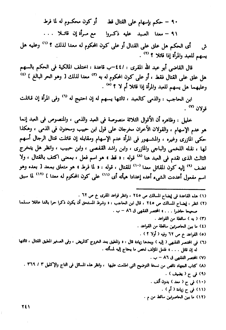 قال القاضى أبو عبد الله المقرى: /44 - ب قاعدة: اختلف المالكية فى الحكم بالسهم هل علق على القتال فقط، أو على كون المحكوم له به معدا لذلك [وهو الحر البالغ] وعليهما هل يسهم للعبد والمرأة إذا قاتلا أم لا؟.