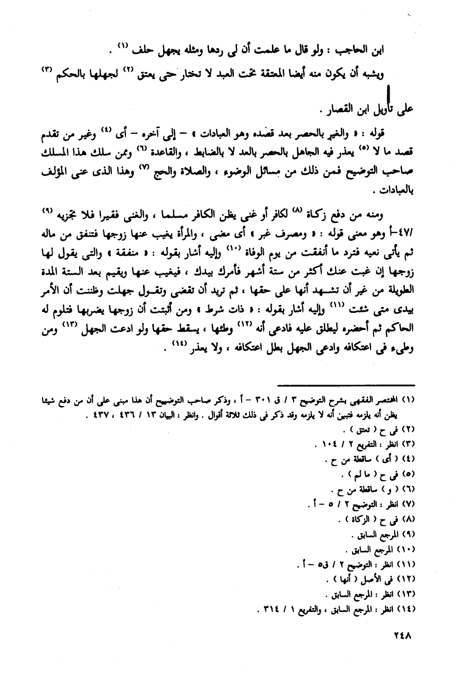 ومنه من دفع زكاة لكافر أو غنى يظن الكافر مسلما، والغني فقيرا لا تجزيه/47 - أوهو معنى قوله: "ومصرف غبر" أى مضى، والمرأة يغيب عنها زوجها فتنفق من ماله ثم يأتى نعيه فترد ما أنفقت من يوم الوفاة وإليه أشار بقوله: "منفقة" والتى يقول لها زوجها إن غبت عنك أكثر من ستة أشهر فأمرك بيدك، فيغيب عنها ويقيم بعد الستة المدة الطويلة من غير أن تشهد أنها على حقها، ثم تريد أن تقضى وتقول جهلت وظننت أن الأمر بيدى متى شئت وإليه أشار بقوله: "ذات شرط" ومن أثبتت أن زوجها يضربها فتلوم له الحاكم ثم أحضره ليطلق عليه فأدعى أنه وطئها يسقط حقها ولو أدعت الجهل ومن وطئ فى اعتكافه وأدعى الجهل بطل اعتكافه، ولا يعذر.