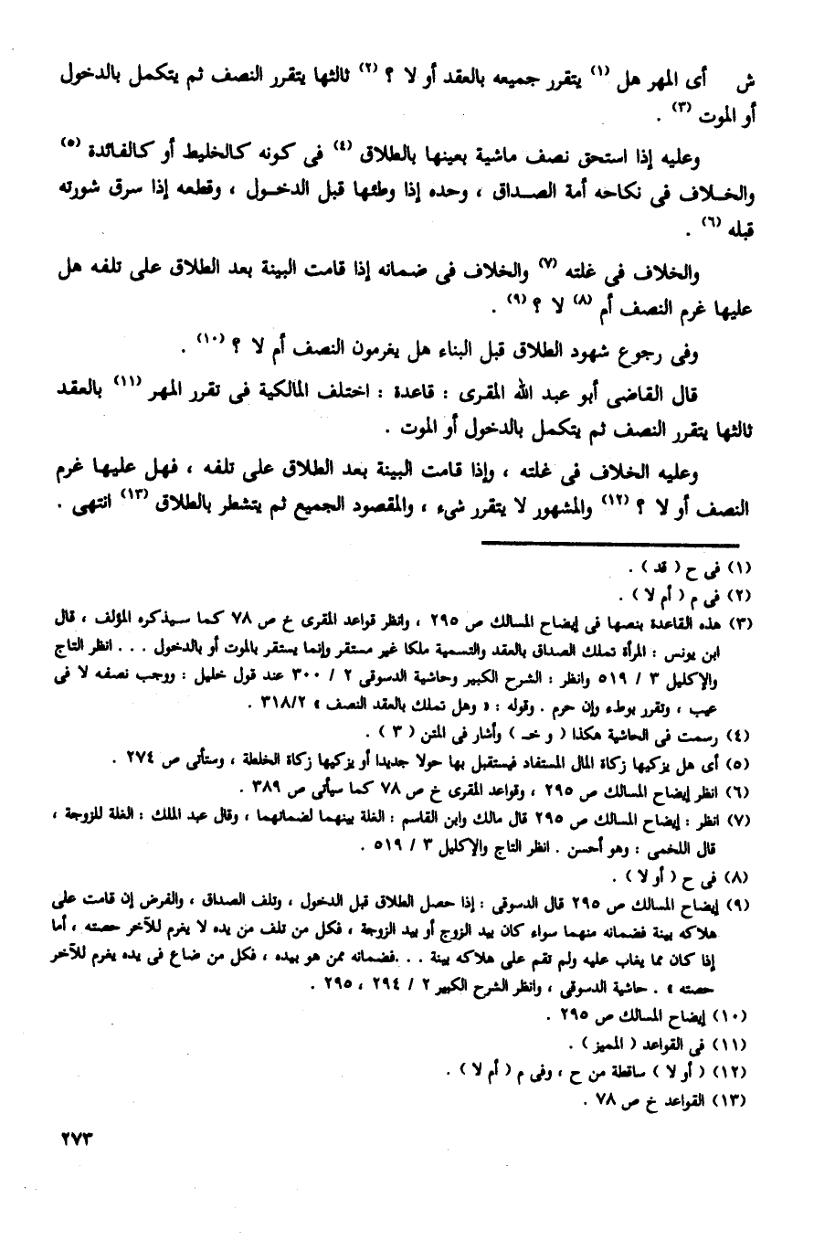قال القاضى أبو عبد الله المقرى: قاعدة: اختلف المالكية فى تقرر المهر بالعقد ثالثها يتقرر النصف ثم يتكمل بالدخول أو الموت.