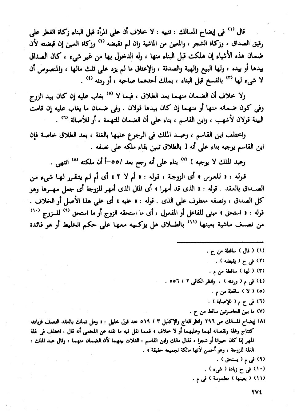 قال في إيضاح المسالك: تنبيه: لا خلاف أن على المرأة قبل البناء زكاة الفطر على رقيق الصداق، وزكاة الشجر، والمعين من الماشية وان لم تقبضه وزكاة العين إن قبضته لأن ضمان هذه الأشياء إن هلكت قبل البناء منها، وله الدخول بها من غير شئ، كان الصداق بيدها أو بيده، ولها البيع والهبة والصدقة، والإعتاق ما لم يزد على ثلث مالها، والمنصوص أن لا شئ لها بالفسخ قبل البناء، بملك أحدهما صاحبه، أو ردته.