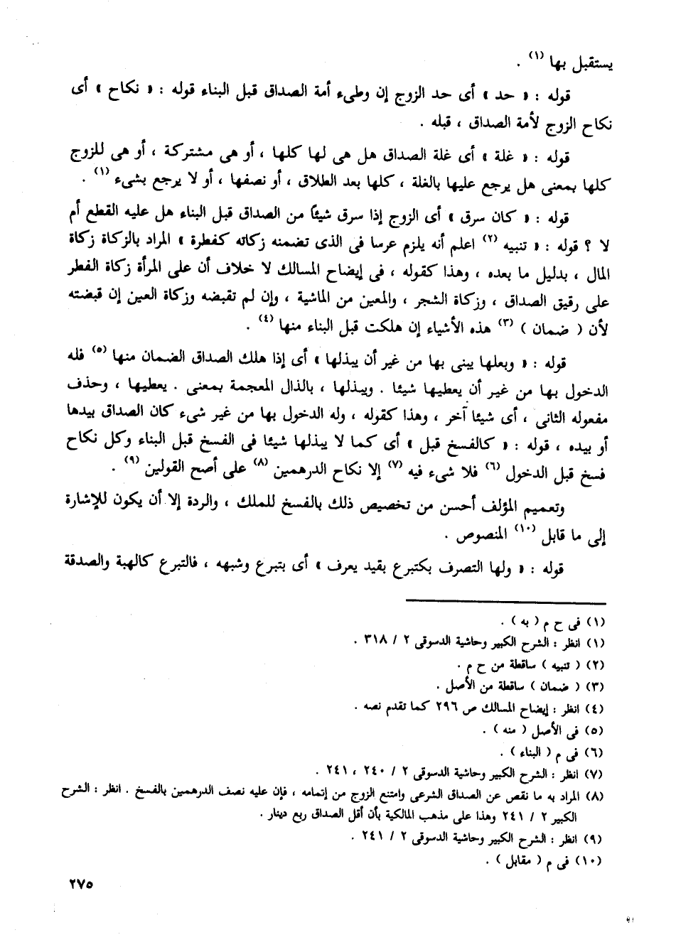 قوله: "كان سرق" أى الزوج إذا سرق شيئاً من الصداق قبل البناء هل عليه القطع أم لا؟ قوله: "تنبيه اعلم أنه يلزم عرسا فى الذى تضمنه زكاته كفطرة" المراد بالزكاة زكاة المال، بدليل ما بعده، وهكذا قوله، فى إيضاح المسالك لا خلاف أن على المرأة زكاة الفطر على رقيق الصداق، وزكاة الشجر، والمعين من الماشية، وإن لم تقبضه وزكاة العين إن قبضته لأن (ضمان) هذه الأشياء إن هلكت قبل البناء منها.