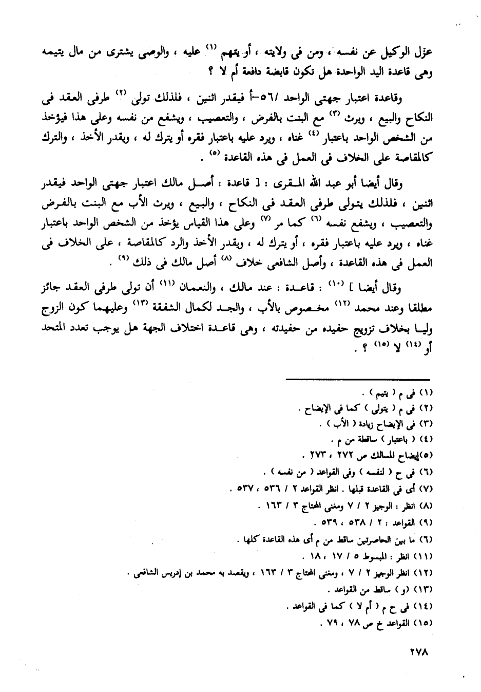 وقاعدة اعتبار جهتى الواحد /56 - أفيقدر اثنين، فلذلك تولى طرفى العقد فى النكاح والبيع، ويرث مع البنت بالفرض، والتعصيب، ويشفع من نفسه وعلى هذا فيؤخذ من الشخص الواحد باعتبار غناه، ويرد عليه باعتبار فقره أو يترك له، ويقدر الأخذ، والترك كالمقاصة على الخلاف في العمل فى هذه القاعدة.