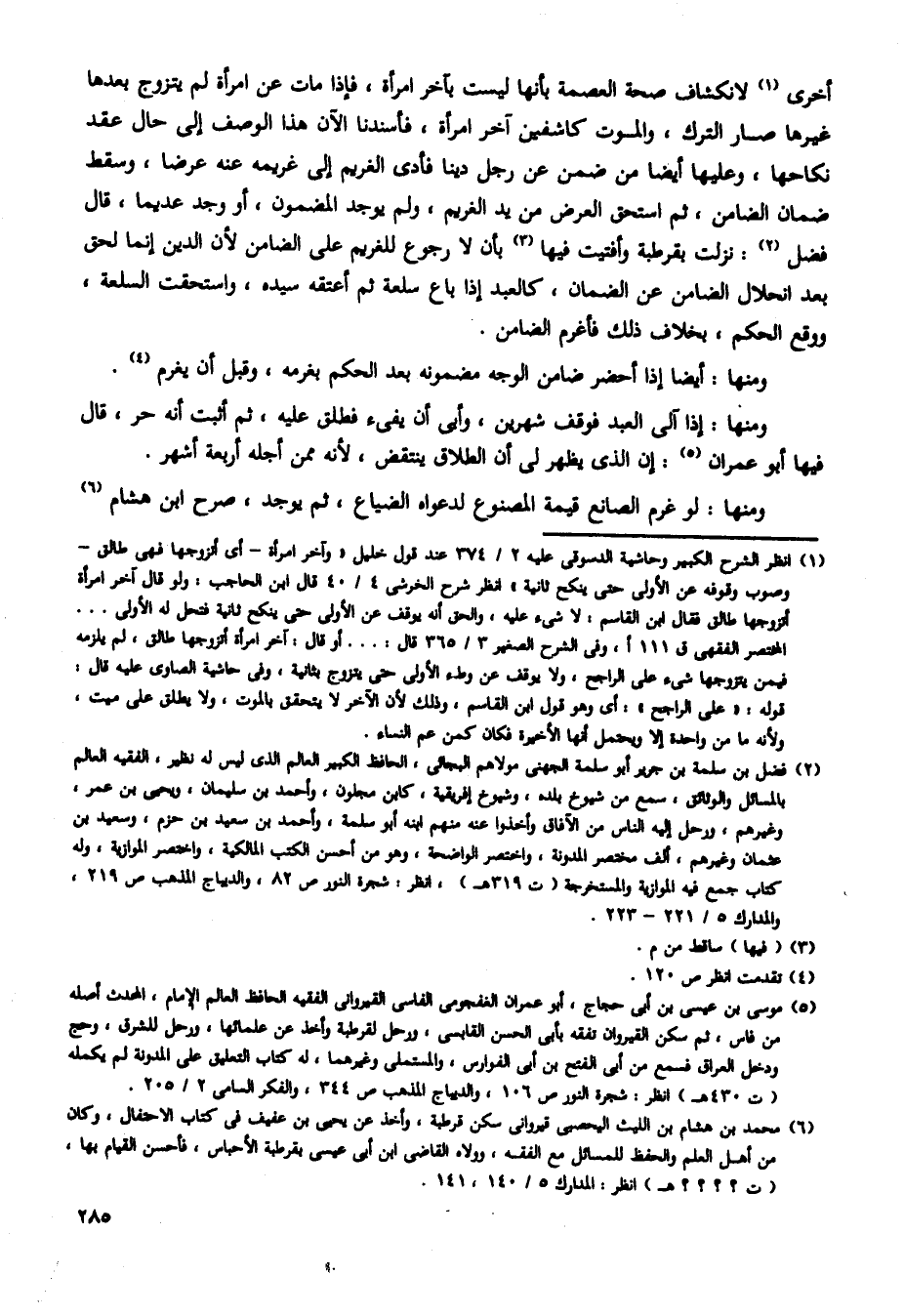 أخرى لانكشاف صحة العصمة بأنها ليست بآخر امرأة، فإذا مات عن امرأة لم يتزوج بعدها غيرها صار الترك، والموت كاشفين آخر امرأة، فأسندنا الآن هذا الوصف إلى حال عقد نكاحها، وعليها أيضا من ضمن عن رجل دينا فأدى الغريم إلى غريمه عنه عرضا، وسقط ضمان الضامن، ثم استحق العرض من يد الغريم، ولم يوجد المضمون، أو وجد عديما، قال فضل: نزلت بقرطبة وأفتيت فيها بأن لا رجوع للغريم على الضامن لأن الدين إنما لحق بعد انحلال الضامن عن الضمان، كالعبد إذا باع سلعة ثم أعتقه سيده، واستحقت السلعة، ووقع الحكم، بخلاف ذلك فأغرم الضامن.