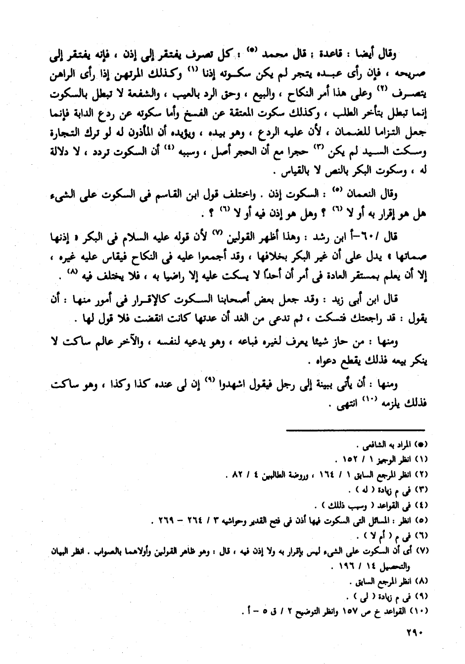 وقال أيضاً: قاعدة: قال محمد: كل تصرف يفتقر إلى إذن، فإنه يفتقر إلى صريحه، فإن رأى عبده يتجر لم يكن سكوته إذنا وكذلك المرتهن إذا رأى الراهن يتصرف وعلى هذا أمر النكاح، والبيع، وحق الرد بالعيب، والشفعة لا تبطل بالسكوت إنما تبطل بتأخر الطلب، وكذلك سكوت المعتقة عن الفسخ وأما سكوته عن ردع الدابة فإنما جعل التزاما للضمان، لأن عليه الردع، وهو بيده، ويؤيده أن المأذون له لو ترك التجارة وسكت السيد لم يكن حجرا مع أن الحجر أصل، وسببه أن السكوت تردد، لا دلالة له، وسكوت البكر بالنص لا بالقياس.