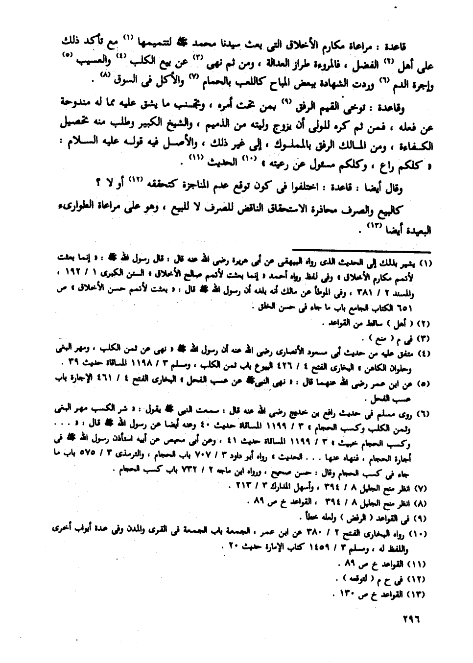قاعدة: مراعاة مكارم الأخلاق التي بعث سيدنا محمد صلى اله عليه وسلم لتنميمها مع تأكد ذلك على أهل الفضل، فالمروءة طراز العدالة، ومن ثم نهى عن بيع الكلب والعسيب وإجرة الدم وردت الشهادة ببعض المباح كاللعب بالحمام والأكل فى السوق.