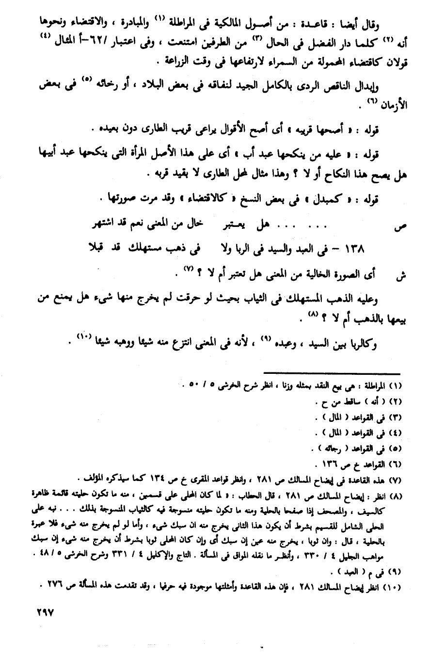 وقال أيضا: قاعدة: من أصول المالكية فى المراطلة والمبادرة، والاقتضاء ونحوها أنه كلما دار الفضل فى الحال من الطرفين امتنعت، وفى اعتبار /62 - أالمثال قولان كاقتضاء المحمولة من السمراء لارتفاعها فى وقت الزراعة.