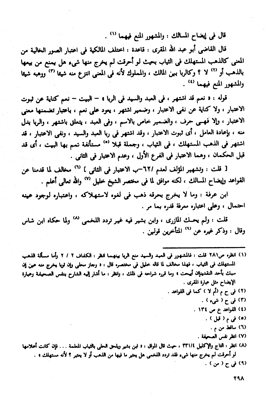قال القاضى أبو عبد الله المقرى: قاعدة: اختلف المالكية في اعتبار الصور الخالية من المعنى كالمذهب المستهلك فى الثياب بحيث لو أحرقت لم يخرج منها شئ هل يمنع من بيعها بالذهب أو لا؟ وكالربا بين المالك، والمملوك لأنه فى المعنى انتزع منه شيئا ووهبه شيئا والمشهور المنع فيهما.