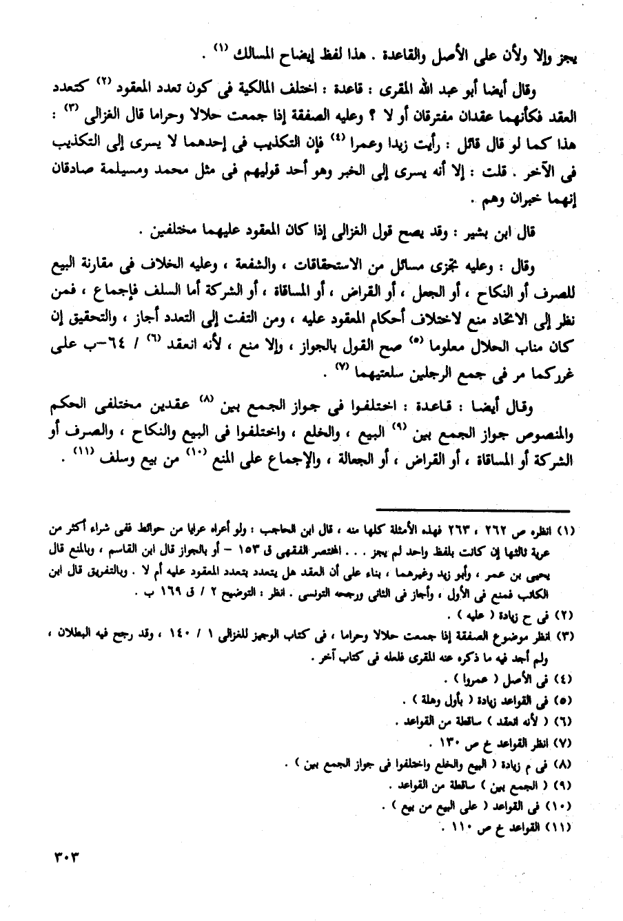 وقال أيضا: قاعدة: اختلفوا فى جواز الجمع بين عقدين مختلفى الحكم والمنصوص جواز الجمع بين البيع، والخلع، واختلفوا فى البيع والنكاح، والصرف أو الشركة أو المساقاة، أو القراض، أو الجعالة، والإجماع على المنع من بيع وسلف.