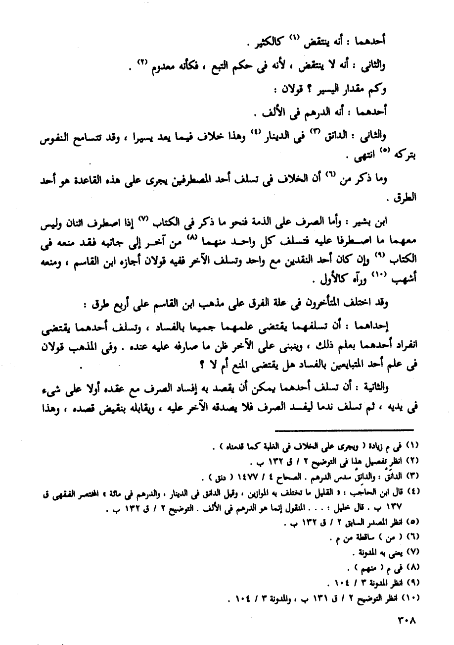 ابن بشير: وأما الصرف على الذمة فنحو ما ذكر فى الكتاب إذا اصطرف اثنان وليس معهما ما اصطرفا عليه فتسلف كل واحد منهما من آخر إلى جانبه فقد منعه فى الكتاب وإن كان أحد النقدين مع واحد وتسلف الآخر ففيه قولان أجازه ابن القاسم، ومنعه أشهب ورآه كالأول.