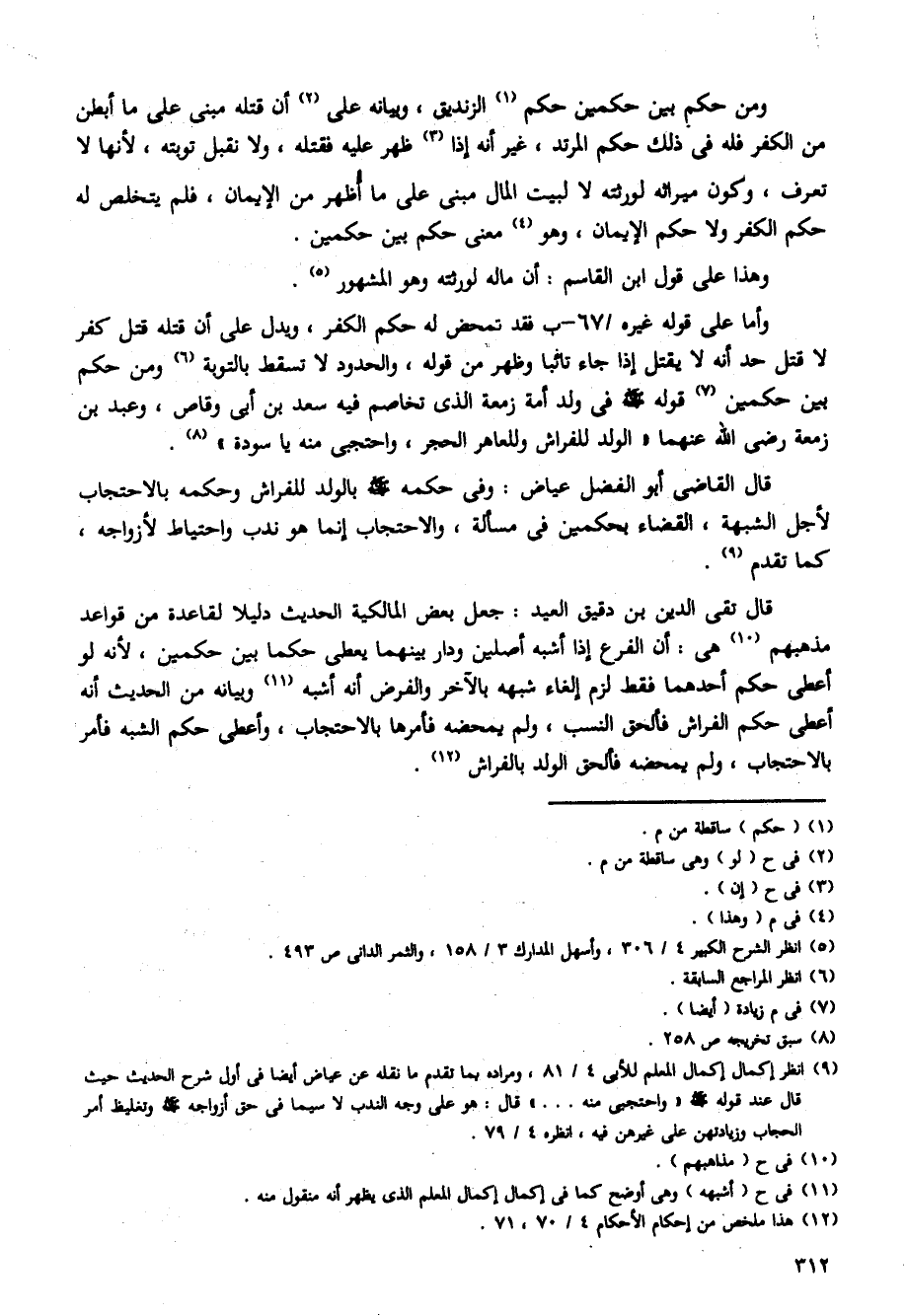 وأما على قوله غيره /67 - ب فقد تحمض له حكم الكفر، ويدل على أن قتله قتل كفر لا قتل حد أنه لا يقتل إذا جاء تائبا وظهر من قوله، والحدود لا تسقط بالتوبة ومن حكم بين حكمين قول صلى الله عليه وسلم فى ولد أمة زمعة الى تخاصم فيه سعد بن أبى وقاص، وعبد بن زمعة رضى الله عنهما "الولد للفراش وللعاهر الحجر، واحتجبى منه يا سودة".