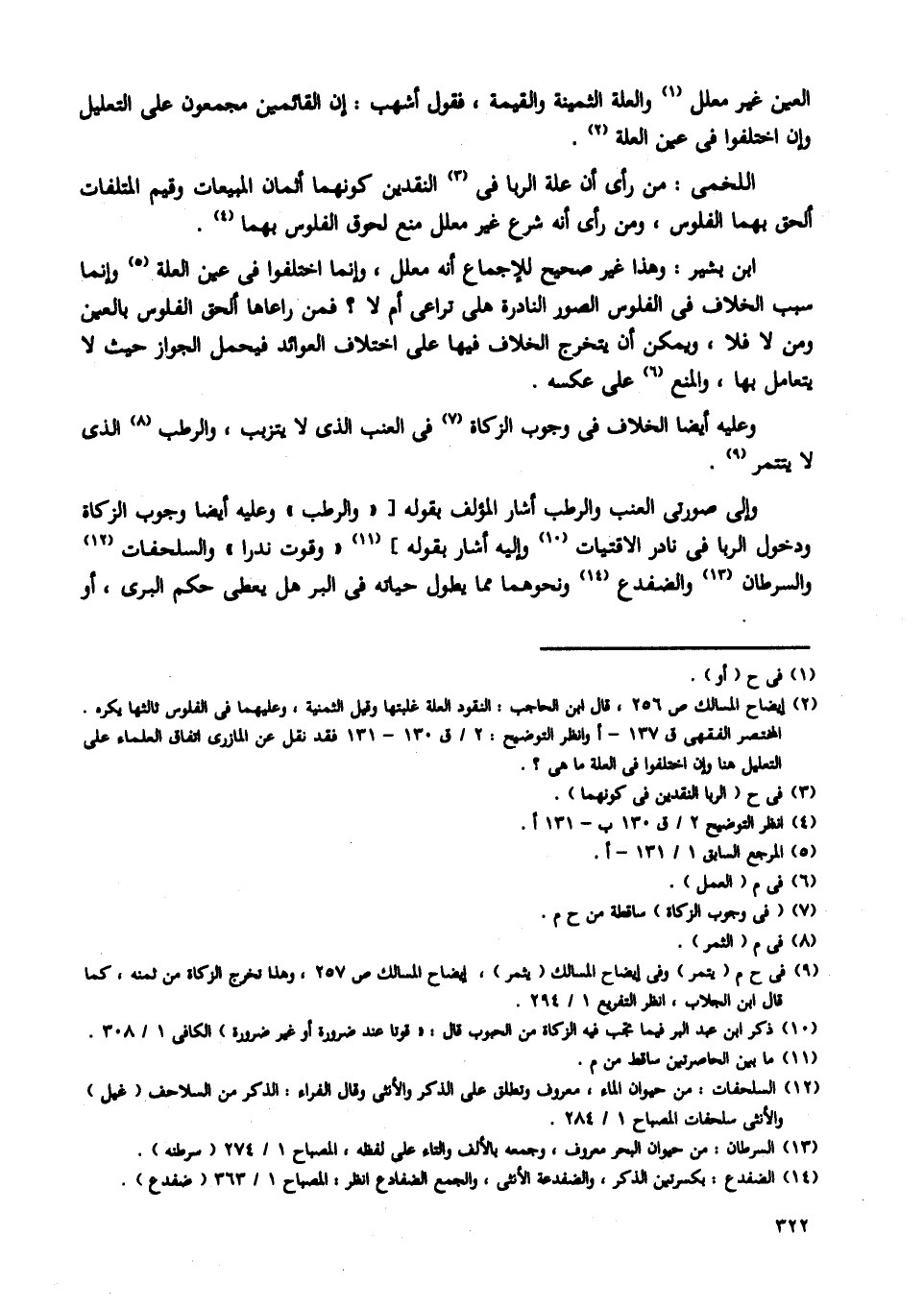 ابن بشير: وهذا غير صحيح للإجماع أنه معلل، وإنما اختلفوا فى عين العلة وإنما سبب الخلاف فى الفلوس الصور النادرة هلى تراعى أم لا؟ فمن راعاها ألحق الفلوس بالعين ومن لا فلا، ويمكن أن يتخرج الخلاف فيها على اختلاف العوائد فيحمل الجواز حيث لا يتعامل بها، والمنع على عكسه.