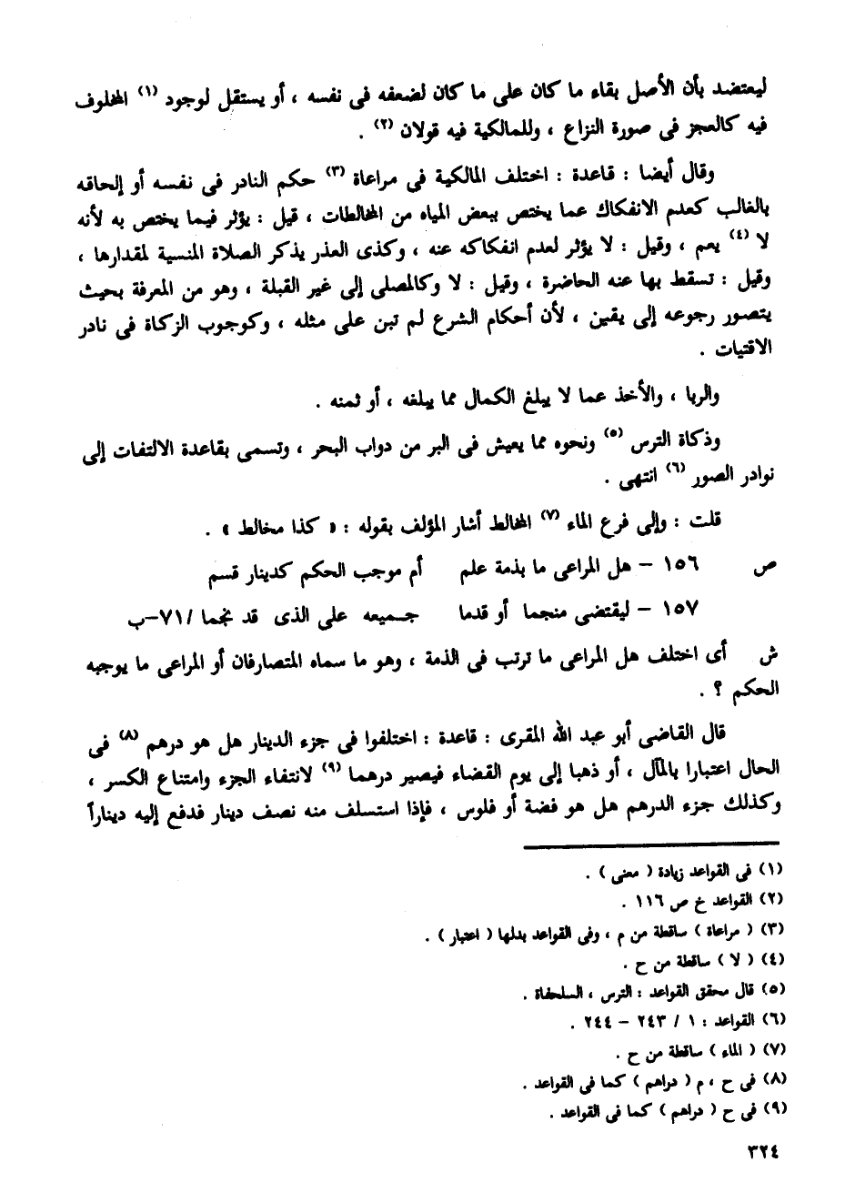 وقال أيضا: قاعدة: اختلف المالكية فى مراعاة حكم النادر فى نفسه أو إلحاقه بالغالب كعدم الانفكاك عما يختص ببعض المياه من المخالطات، قيل: يؤثر فيما يختص به لأنه لا يعم، وقيل: لا يؤثر لعدم انفكاكه عنه، وكذى العذر يذكر الصلاة المنسية لمقدارها، وقيل: تسقط بها عنه الحاضرة، وقيل: لا وكالمصلى إلى غير القبلة، وهو من المعرفة بحيث يتصور رجوعه إلى يقين، لأن أحكام الشرع لم تبن على مثله، وكوجوب الزكاة فى نادر الاقتيات.