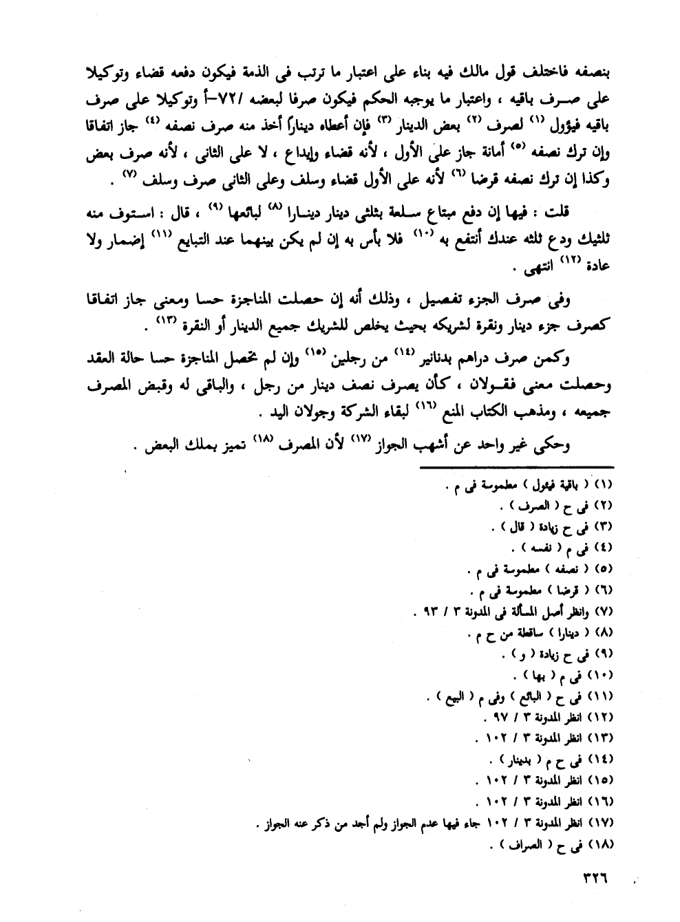 وكمن صرف دراهم بدنانير من رجلين وإن لم تحصل المناجزة حسا حالة العقد وحصلت معنى فقولان، كان يصرف نصف دينار من رجل، والباقى له وقبض المصرف جميعه، ومذهب الكتاب المنع لبقاء الشركة وجولان اليد.