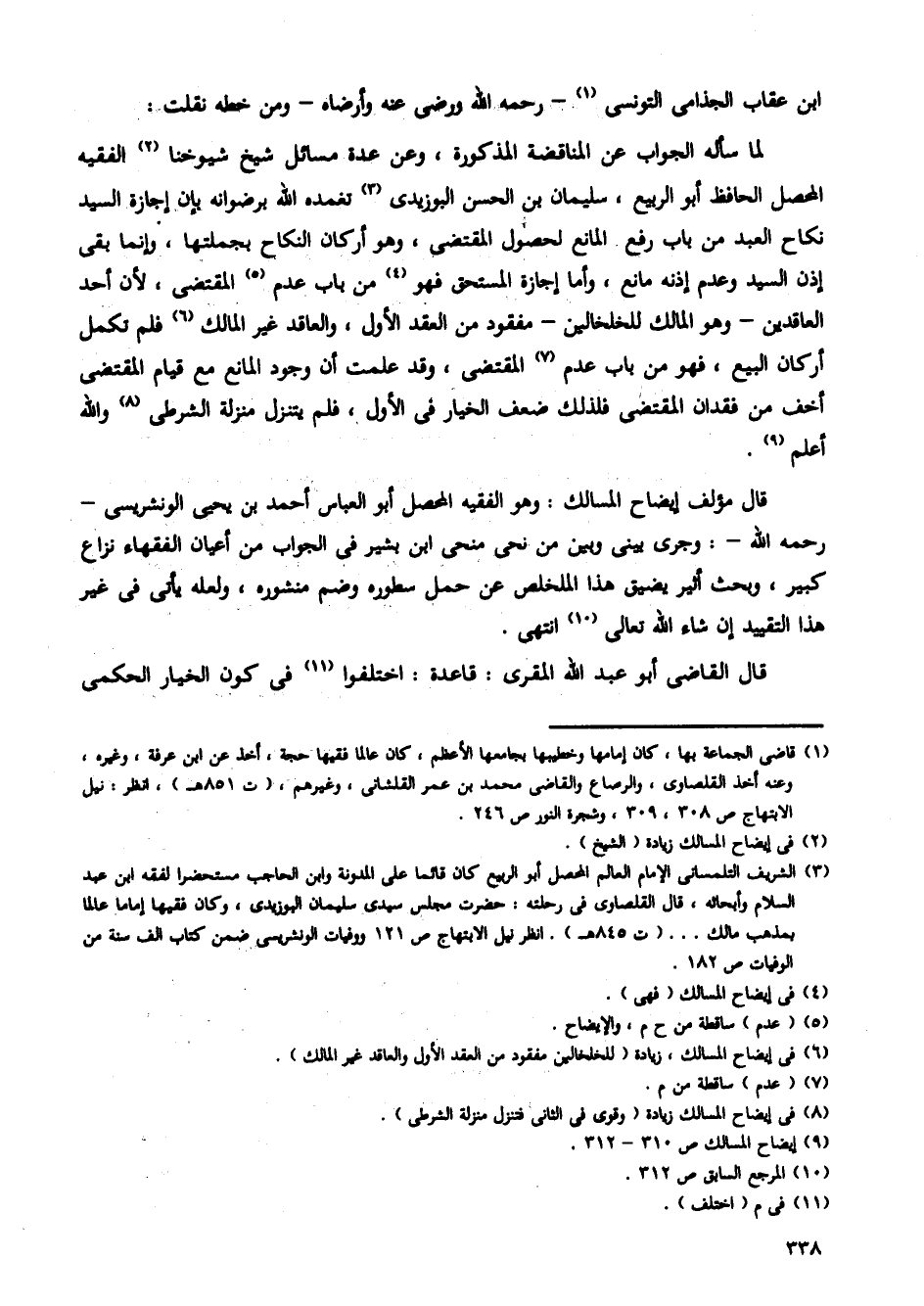 قال مؤلف إيضاح المسالك: وهو الفقيه المحصل أبو العباس أحمد بن يحيى الونشريسى -رحمه الله-: وجرى بينى وبين من نحى منحى ابن بشير فى الجواب من أعيان الفقهاء نزاع كبير، وبحث أثير يضيق هذا الملخلص عن حمل سطوره وضم منشوره، ولعله يأتى فى غير هذا التقييد إن شاء الله تعالى انتهى.