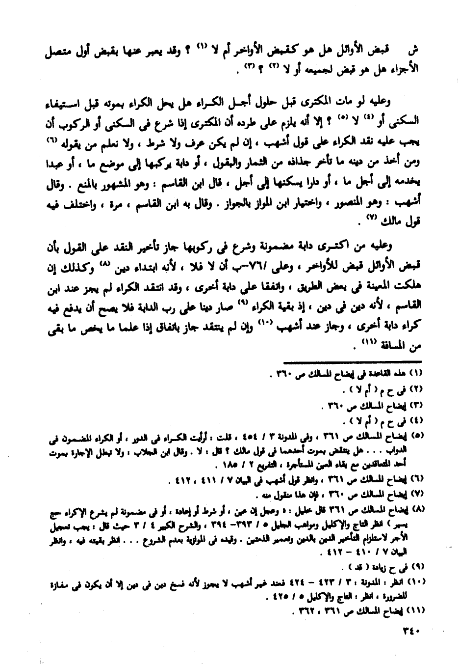 وعليه من اكترى دابة مضمونة وشرع فى ركوبها جاز تأخير النقد على القول بأن قبض الأوائل قبض للأواخر، وعلى /76 - ب أن لا فلا، لأنه ابتداء دين وكذلك إن هلكت المعينة فى بعض الطريق، واتفقا على دابة أخرى، وقد انتقد الكراء لم يجز عند ابن القاسم، لأنه دين فى دين، إذ بقية الكراء صار دينا على رب الدابة فلا يصح أن يدفع فيه كراء دابة أخرى، وجاز عند أشهب وإن لم ينتقد جاز باتفاق إذا علما ما يخص ما بقى من المسافة.