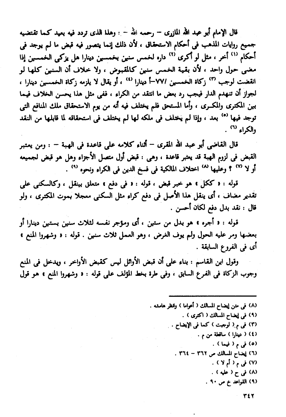 قال الإمام أبو عبد الله المازري -رحمه الله-: وهذا الذى تردد فيه بعيد كما تقتضيه جميع روايات المذهب فى أحكام الاستحقاق، لأن ذلك إنما يتصور فيه قبض ما لم يوجد فى أحكام أخر، مثل لو أكرى داره لخمس سنين بخمسين دينارا هل يزكى الخمسين إذا مضى حول واحد، لأن بقية الخمس سنين كالمقبوض، ولا خلاف أن السنين كلها لو انقضت لوجب زكاة الخمسين /77 - أدينارا، أو يقال لا يلزمه زكاة الخمسين دينارا، لجواز أن تنهدم الدار فيجب رد بعض ما انتقد من الكراء، ففى مثل هذا يحسن الخلاف فيما بين المكترى والمكرى، وأما المستحق فلم يختلف فيه أنه من يوم الاستحقاق ملك المنافع التى توجد فيها بعد، وإذا لم يختلف فى ملكه لها لم يختلف فى استحقاقه لما قابلها من النقد والكراء.